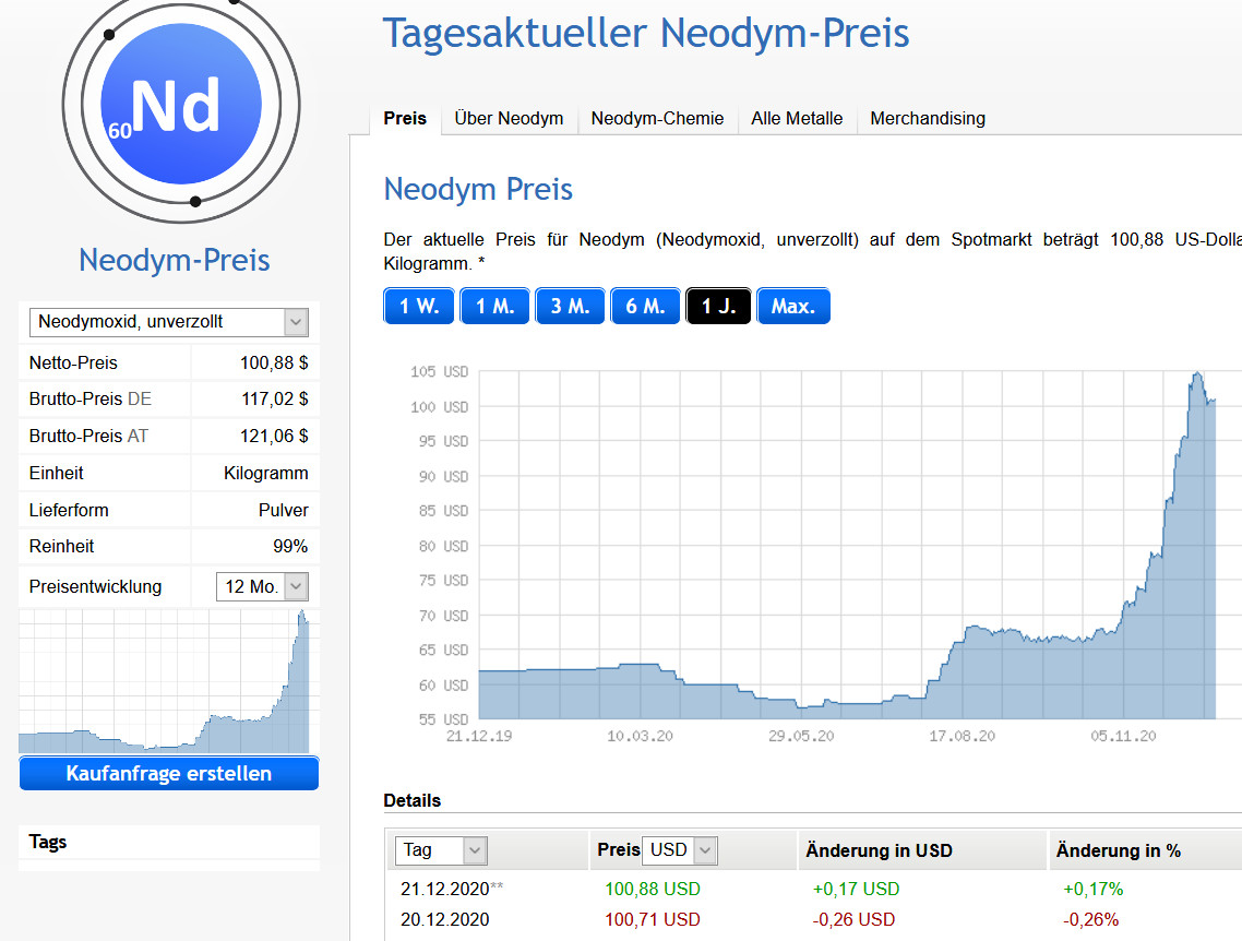 Aber wo Autokonzerne wie Volkswagen und Daimler sich inzwischen über langfristige Lieferverträge mit den Minenkonzernen den Zugriff auf Batteriemetalle wie Lithium und Kobalt sichern, werden die kleinen Magnete meist erst als fertiges Produkt am Ende der Lieferkette eingekauft.