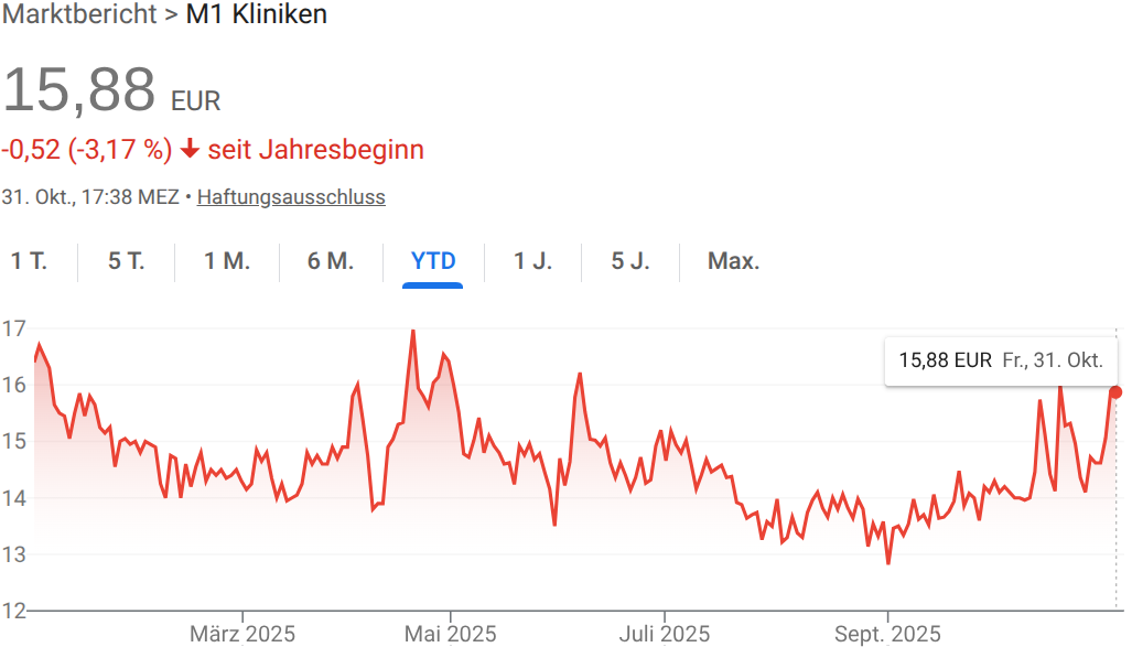 Was ist M1 für ein Wert? M1 Kliniken AG (€13,32 bei Lang & Sc… · 20:01:48) steht 28% unter ihrem 52-Wochen-Hoch von €18,60 am 13. September 2024 und bietet in ihren Kliniken einen Notrufservice für den Hilferuf in WC-Anlagen ab. Ich sehe für die Aktie kein Alarmsignal.