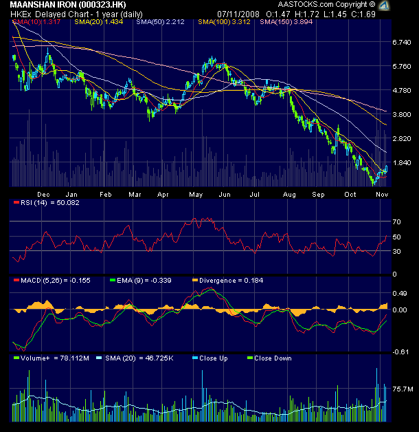 Maanshan Iron (0323-HK) (the "Company") principally engaged in production and sales of iron and steel products is one of the largest iron and steel producers and sellers in China. Its products are roughly divided into four categories, namely steel plates, section steel, bars and wheels. On wheel business side, it has to be mentioned that the Company is the second largest train wheel producer in the world and the first largest in Asia. China's investment in railways to reach RMB2,000 billion by 2020 during the period of the eleventh five-year plan will be favourable to business development of the Company as the standard setter for domestic wheel market.