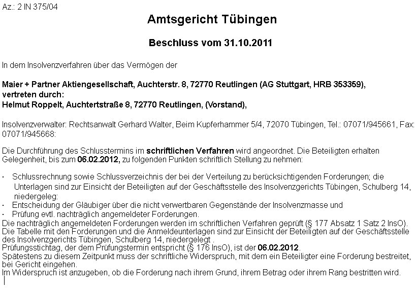 Beschluß Durchführung Schlusstermin zum 6.2.2012