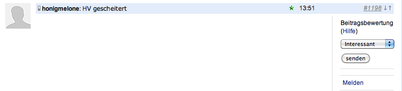 | Wertung | Antworten | Thema | Verfasser | letzter Verfasser | letzter Beitrag | |