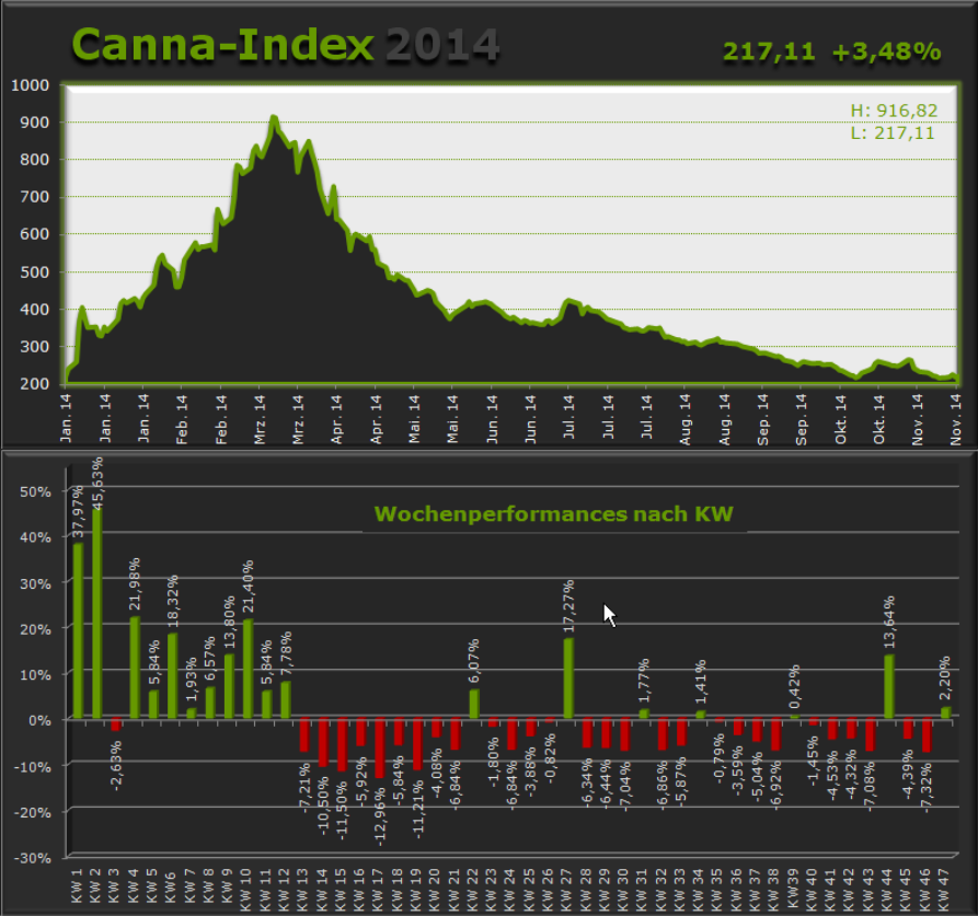Das Jahr 2014 begann mit großen Hoffnungen auf exorbitante Gewinne im Cannabis-Sektor, wo man das Ende der Prohibition bereits flächendeckend kommen sah, nachdem Colorado als erster Bundesstaat Marihuana sogar zu Freizeitzwecken legalisierte. Doch wer nicht bereits Ende 2013 oder früh im Jahre 2014 investiert war und seine Investitionen bis März gewinnbringend abstoßen konnte machte wohl große Verluste, denn ab März platze die Blase - bis heute!