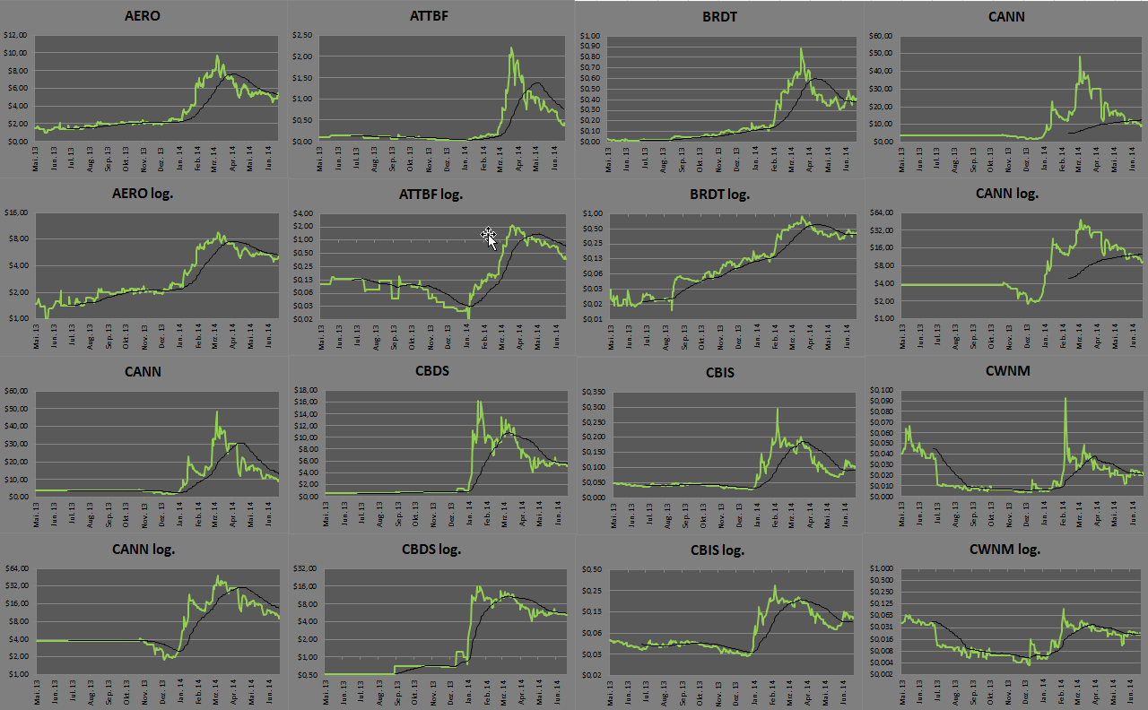 Seit Ende des Jahres 2013 beobachte ich den Marihuana-Aktienmarkt und mein Dejà vu vom Neuen Markt wiederholt sich tatächlich exakt. Zuerst steigt der CannaIndex seit Anfang des Jahres im Hype der Colorado-Legalisierung und der damit einhergehenden Phantasie um knapp 900% auf sein Allzeithoch bei 68,80 Punkten (24.02). Das Allzeithoch ist erst mal vom heutigen Standpunkt aus gesehen in weite Ferne gerückt.