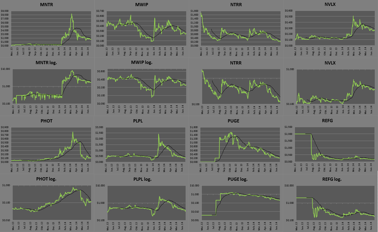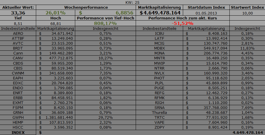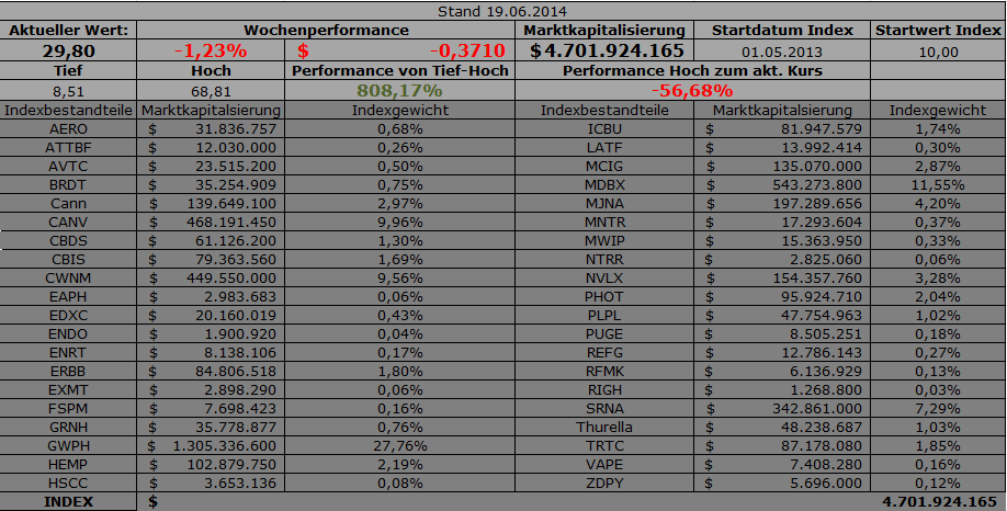 Das Jahr 2014 begann so rosig, man meinte, der Index könne nie fallen. (Es sei denn, man hat den Neuen markt miterlebt ;)) Als die SEC jedoch vom bloßen Zusehen dazu überging, die Öffentlichkeit mehr und mehr auf potenzielle Betrugsrisiken hinzuweisen, klappte der Markt in sich zusammen, alle Titel wurden im Zuge von temporären Handelsaussetzungen in Sippenhaft genommen und abgestraft. Allein in diesem Jahr hat die SEC den Handel von acht börsennotierten Marihuana-Firmen ausgesetzt. Der CannaIndex fiel von seinem Hoch zurück auf ein Jahrestief von 29,66 Punkten (15.04) - dies ist ein Rückgang um -78,26%!