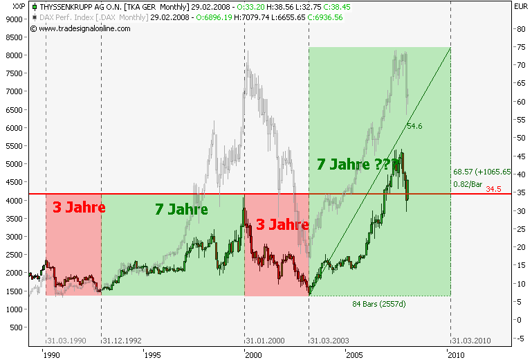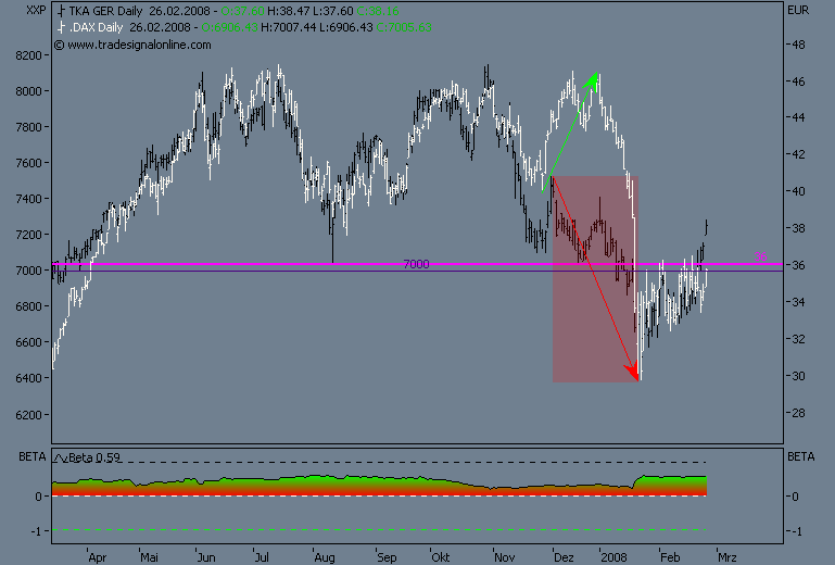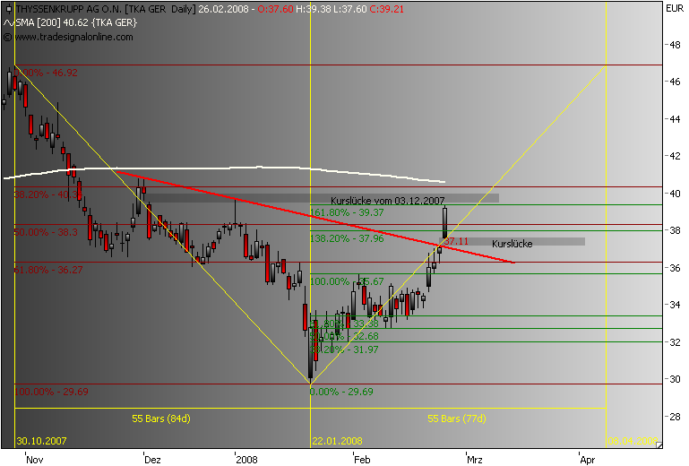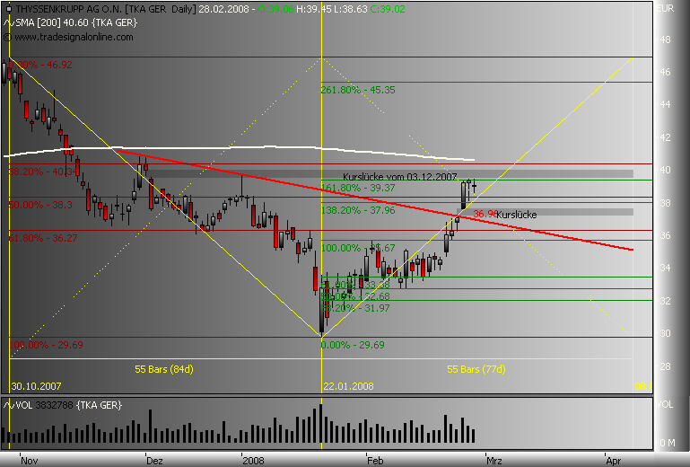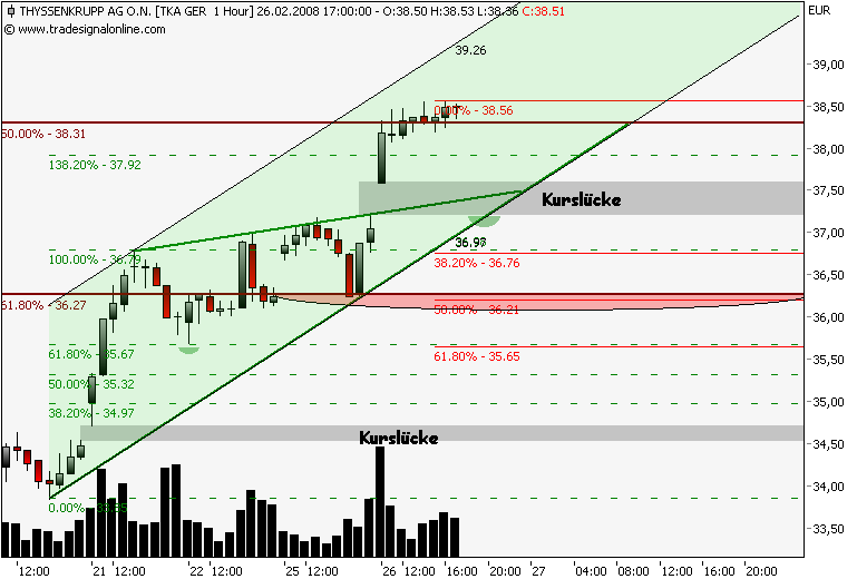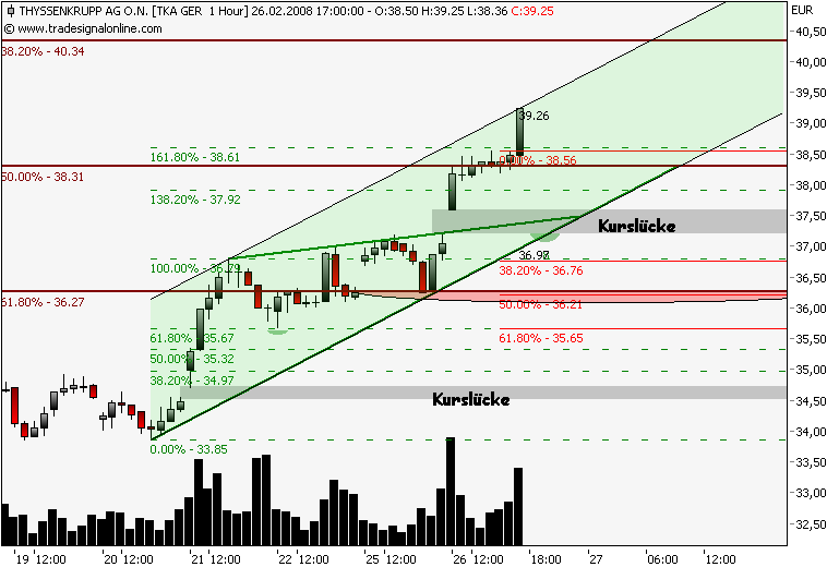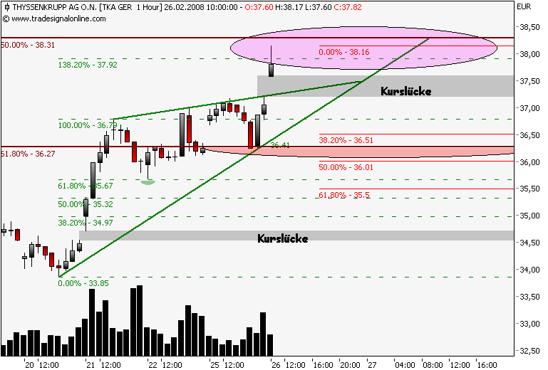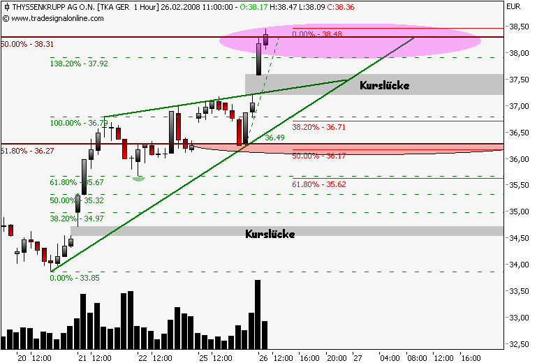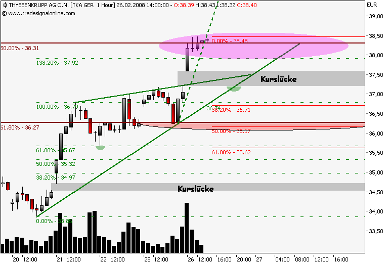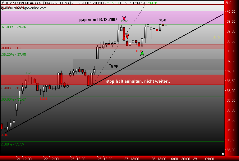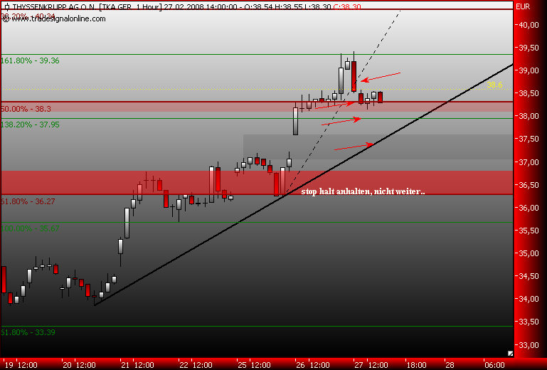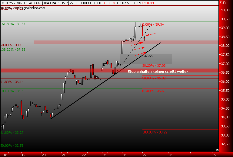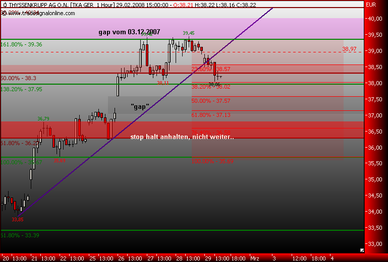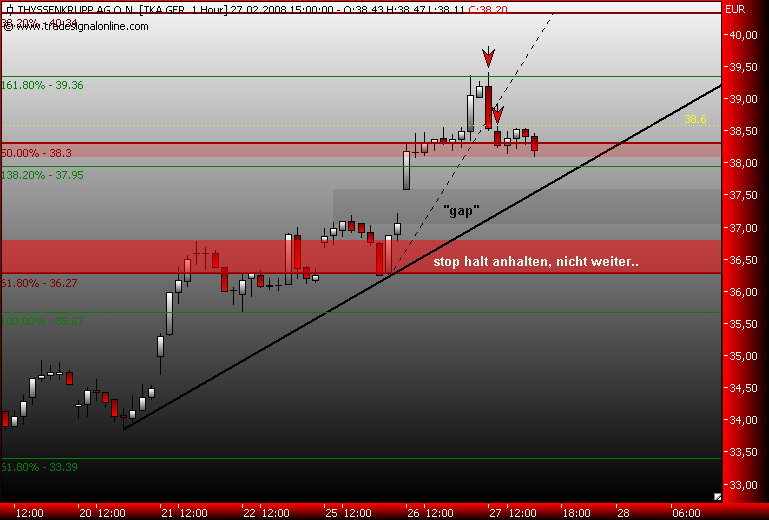 Dax schwächelt, da wird dann die 161,8% genutzt um Gewinn bei TKA mitzunehmen, der steile Aufwärtstrend wurde nach einer stunde gebrochen, drei short signale liegen auf dem weg zum gapclose! im xetra tka liegt der nächste Widerstand bei 38,3€, das ist die 50% marke vom dez.jan.down!
