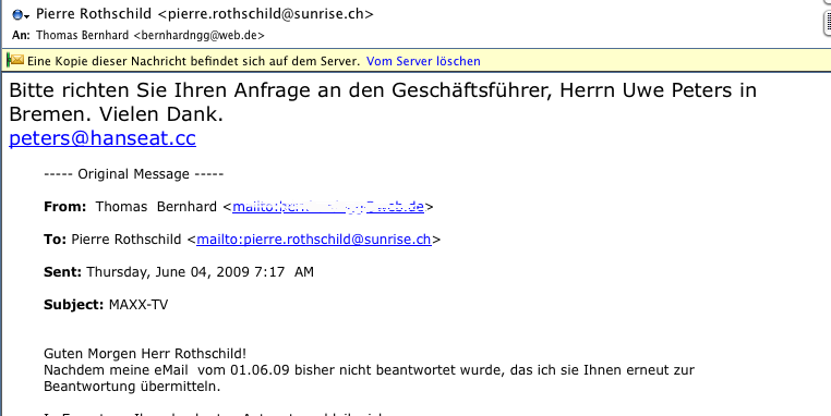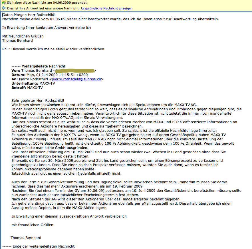 @Avor: Jetzt geht mir ein Licht auf, weshalb mir unterstellt wird, ich würde suggerieren, die Maxx-Begründer seien "abgehauen", auch noch in die Karibik! Ich habe gesagt, sie sind verschwunden, d.h. aus der AG verschwunden, aus Zürich und Bremen - und haben dem Rothschild die Chose hinterlassen.