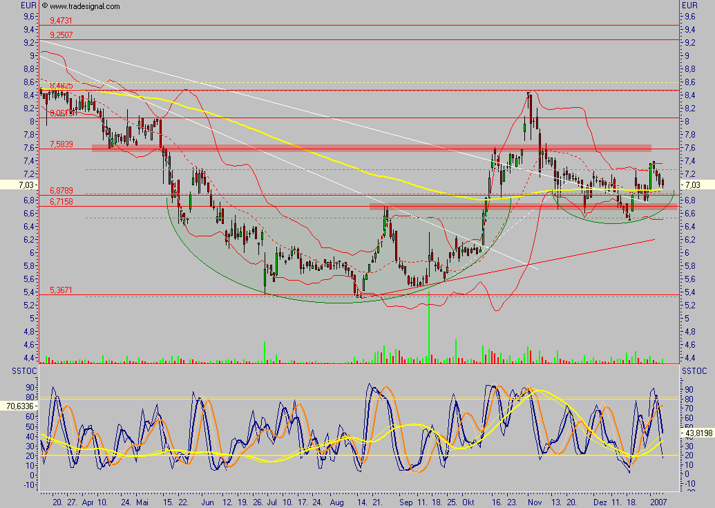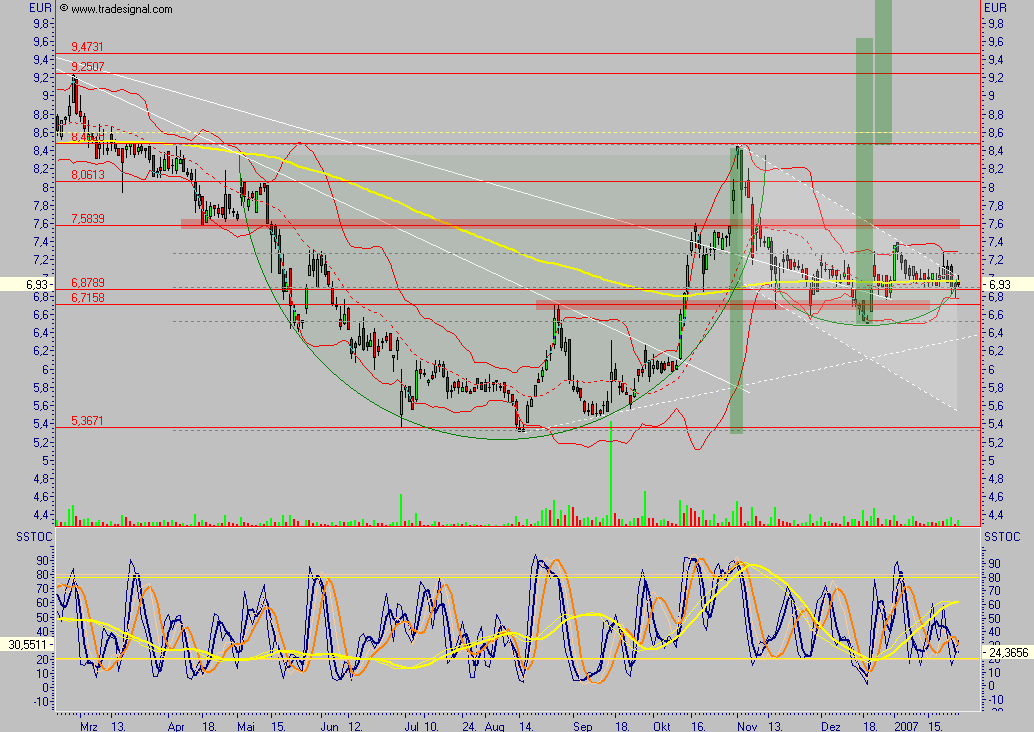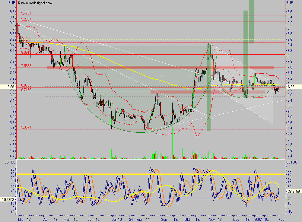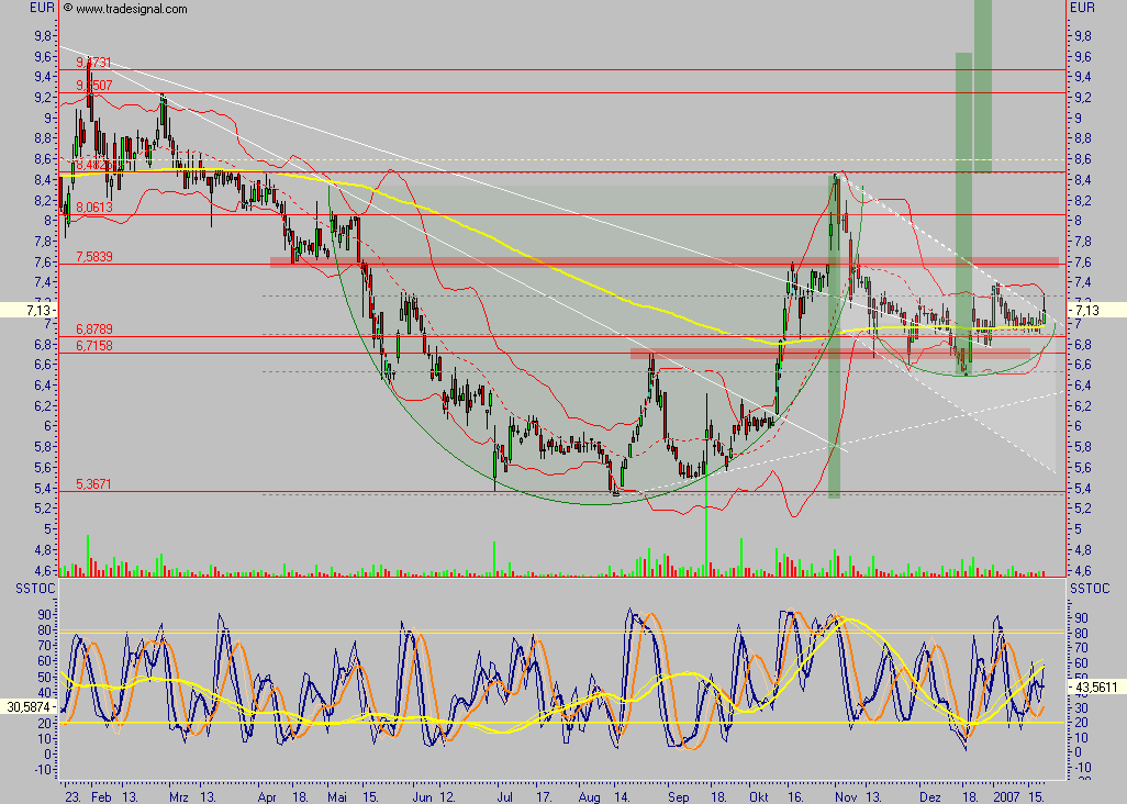 Wenn der Kurs nächstes Jahr um Weihnachten nicht höher als 7-8 € liegt und die Studien Ergebnisse stimmen sehe ich mich genötigt zu diesen billigen Preisen mein gesammtes Depot auf Medigene auszurichten. Deswegen glaube ich nicht das wir nächstes Jahr bei 7-8€ sondern höher sind. Denn immer vorausgestzt die Studien für EndoTag/Bauchspeicheldrüsenkrebs laufen planmäßig wird spätestens 2009 das große erwachen kommen. Das kann man dann bei Gpc-Biotech sehen nur etwas stärker. Gpc hat zwar mit Saltraplatin einen möglichen Blockbuster mit höheren Umsätzen ist aber auch höher bewertet. Das Patent für Saltraplatin läuft bis 2015 was die Gewinne auch begrennt. Saltraplatin scheint aber an Wirksamkeit besser als 17%(Bauchspeicheldrüsenkebs) zu sein(Darüber brauche ich noch genaue Daten!) was wiederum keinen Zweifel an der Zulassung auf Grund der Wirksamkeit lässt. Eine Fusion von Gpc mit Medigene würde den Blockbuster mit der Pipeline zusammenbringen und das Vertriebsnetz in USA mit dem in Europa. Aber Medigene hat auch ohne Fusion beste Chancen nur dauert es halt etwas länger als bei Gpc. Ich sehe begrenztes Risiko aber enorme Chancen. Und minumum 100% in drei Jahren reicht mir auch. Das soll erst mal einer Schlagen. Vorallem weil Biotech und Pharma und besonders Medigene wenig bzw. nicht von Wirtschaftlichen Zyklen abhänging sind/ist sonder nur von erfolgreichen Studen Ergebnissen.