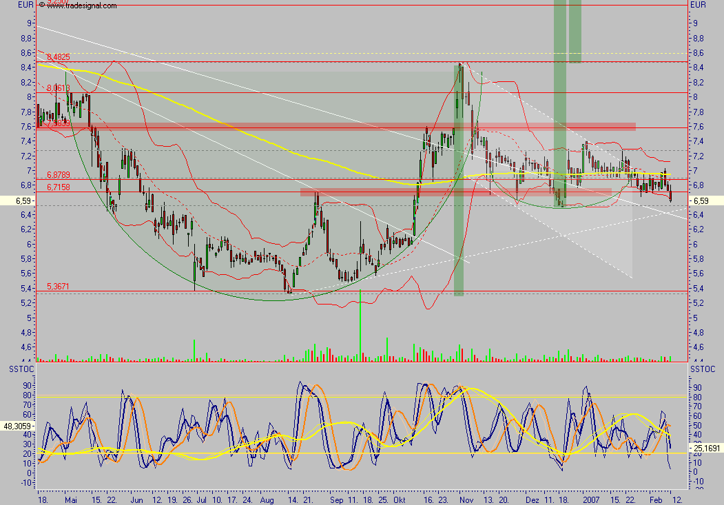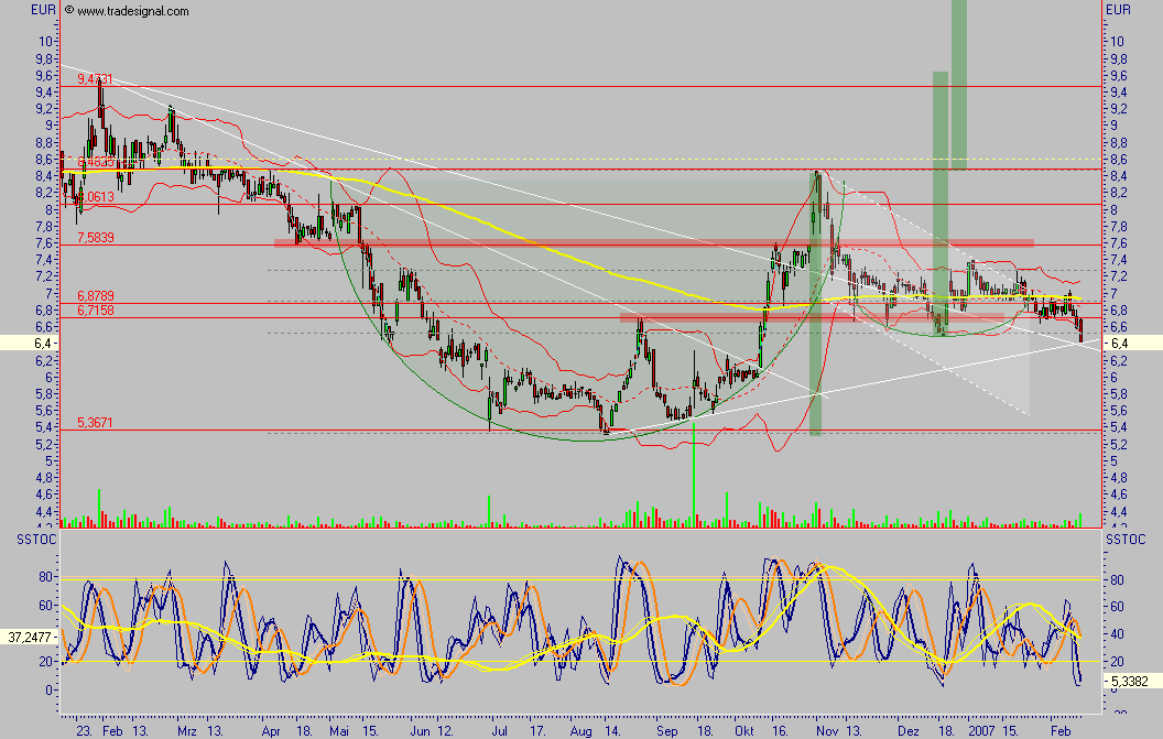 obgleich die meisten Akteure im Plus sein sollten, die auf meine Chartchance reagiert hatten, ich selbst hatte mir wesentlich mehr versprochen, ich hatte zwar unweit vom Top die Hälfte meiner Position gegeben, allerdings bei kurz über 7 wieder aufgestockt, es kommt mir vor, als würden die Amerikaner die Aktie im späteren Handel immer wieder verkaufen, eine Regelmäßigkeit ist aber auch nicht zu erkennen, es sieht für mich aus, als ginge ein größerer Investor marktschonend aus Medigene raus. Vielleicht war eine Übernahme geplant und mit Avidex kommt diese nicht mehr in Frage ? Auf jeden Fall halte ich Medigene derzeit für stark unterbewertet, der Markt ist aber entweder anderer Meinung oder hat ein berechtigtes Interesse, den Kurs unten zu halten, ich weiß es nicht. Vielleicht soll auch nur der nehe Haupttrend nochmals getestet werden, um dann, in Bestätigung dieses, neue Verlaufshochs zu rechtfertigen ?