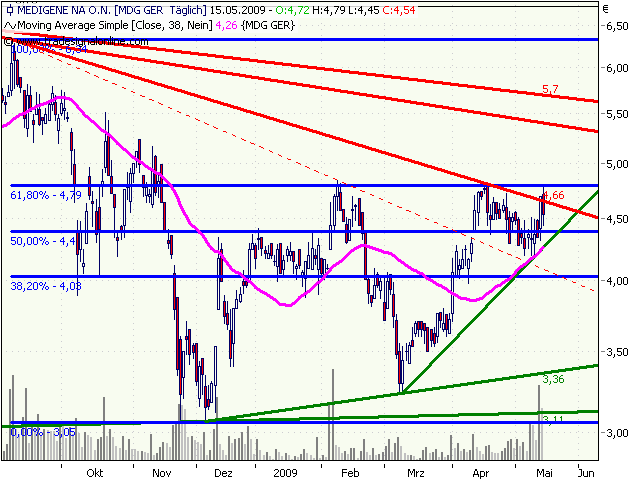 Jetzt noch ein Satz zu dem Kollegen der meinte Medigene sei zu einem Zockerpapier verkommen und er würde seine Aktien verkaufen um seinen Gewinn einzustreichen. Eine durchaus verständliche Position, aber möglicherweise auch ein Fehler. Wenn du schon der Meinung bist, dass es sich hier um ein Zockerpapier handelt, gehörst du ja auch zu der Kategorie - ein längeres Investment hat es bei dir ja nicht gegeben. Selbstverständlich ist ein Gewinnerst dann ein Gewinn, wenn man ihn realsiert hat. Warum arbeitest du nicht mit einer stop/loss Order und stellst so sicher, dass du wenigstens einen Teil deines Gewinnes realsieren kannst? Du kannst natürlich auch gerne wieder aussteigen, solltest dich aber nicht in ca. 5 Wochen über deinen entgangenen Gewinn ärgern sondern dich einfah darüber freuen, dass du einen Gewinn von ca. 40 % einstreichen konntest.