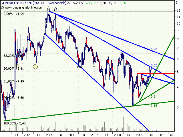 Die Medigene-Aktie hat am Donnerstag den Tags zuvor verzeichneten Rebreak über 4,85 Euro bestätigt. Das Tagestief lag bei 4,86 Euro, während der Schlusskurs bei 5,00 Euro notiert wurde. Aus technischer Sicht überwiegt derzeit die lange gestrige Kerzenlunte, die ein Punkt für die bullishe Ausrichtung der Biotechaktie darstellt. Allerdings ist Medigene am Donnerstag kein Ausbruch über den Widerstand bei 5,11/5,16 Euro gelungen, ein Ausbruchsversuch scheiterte, wie schon Tags zuvor lag das Tageshoch bei 5,10 Euro. Die genannte Widerstandszone sowie die Unterstützung unterhalb von 4,85 Euro bilden eine Tradingrange, sodass die Aktie bei Ausbruch aus der Range prozyklische Handelssignale generiert. Nach oben hin läge das Ziel an der Topzone 5,38/5,45 Euro, während nach unten hin bis 4,56 Euro einige Unterstützungslinien vorhanden sind.