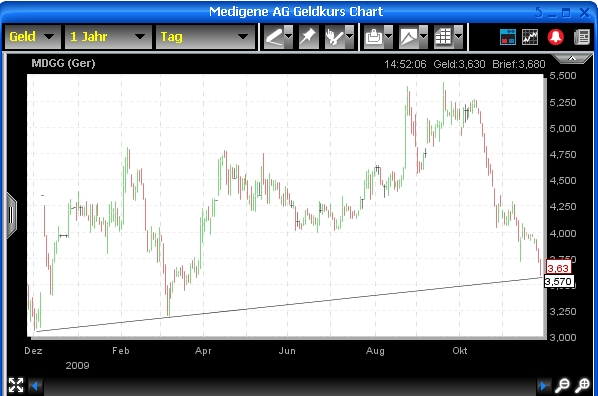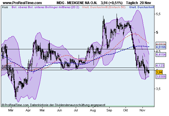 Hatte übrigens Medigene von Anfang an, daher auch der Nickname. Habe mit der Aktie im Börsenboom gut Geld verdient (insgesamt hab ich aber vom Crash 2000 nur Lehrgeld bezahlt), der Kurs stand bei 130 im Alltimehigh. 20 hatte ich noch gehalten, zum Glück meine Aktien davor bei 110 und bei knapp 90 verkauft. Nun hab ich vorm letzten Anstieg wieder ein paar gekauft, durch den Rücksetzer aber auch mit der neuen Posi im Minus. Werde weiter warten, da die Posi immer noch klein ist. Aufstocken werd ich erstmal nicht, verkaufen aber auch nicht.