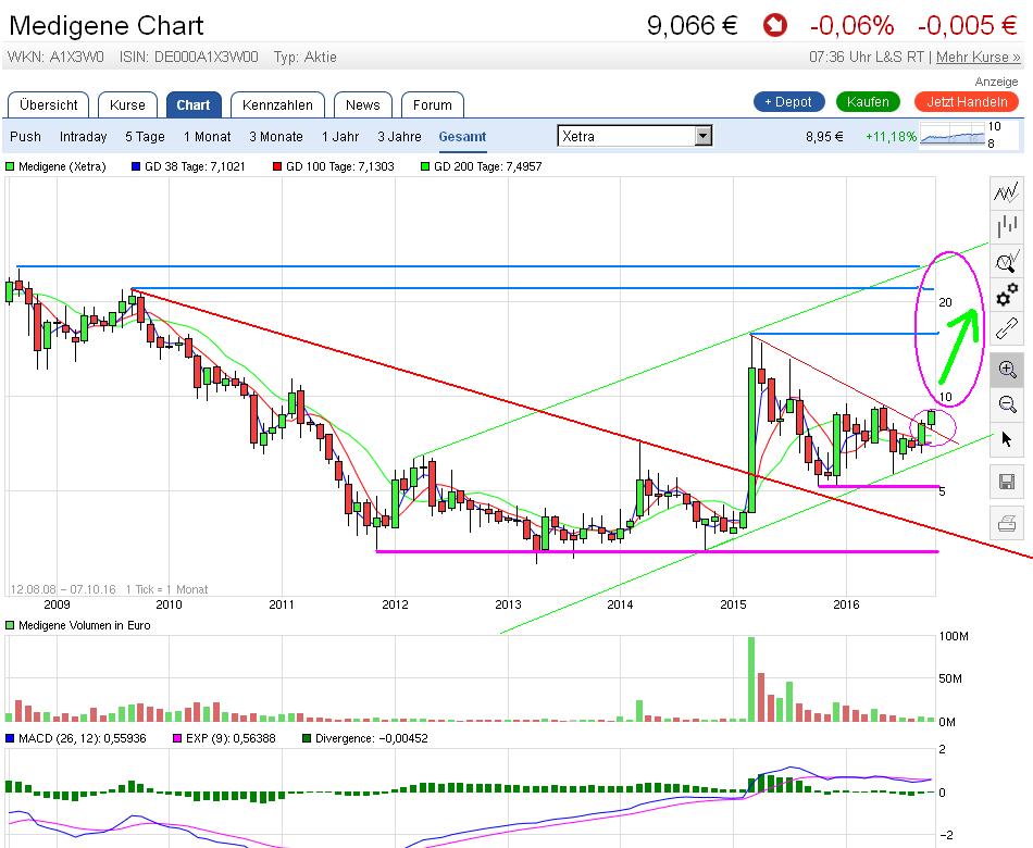 Sobald Medigene kurstechnische Kapriolen hinlegt, kann man hier wieder Einzeiler von Usern lesen, die ansonsten kaum anwesend sind aber keinen Mehrwert haben. Damit muss man wohl leben. Medipiss kann hier gerne wieder posten, vielleicht gelingt es ihm ja auch einmal Geld mit Medigene zu verdienen. Er hat das Untenehmen ja lange genug belgeitet. Leider bin ich zu spät eingestiegen und zu früh ausgestiegen bei diesem jetzigen Hype. Aber ich werde mich an dem Kursanstieg wieder beteiligen ab nächste Woche. Mal sehen, ob ich länger warte oder gleich wieder einsteige.