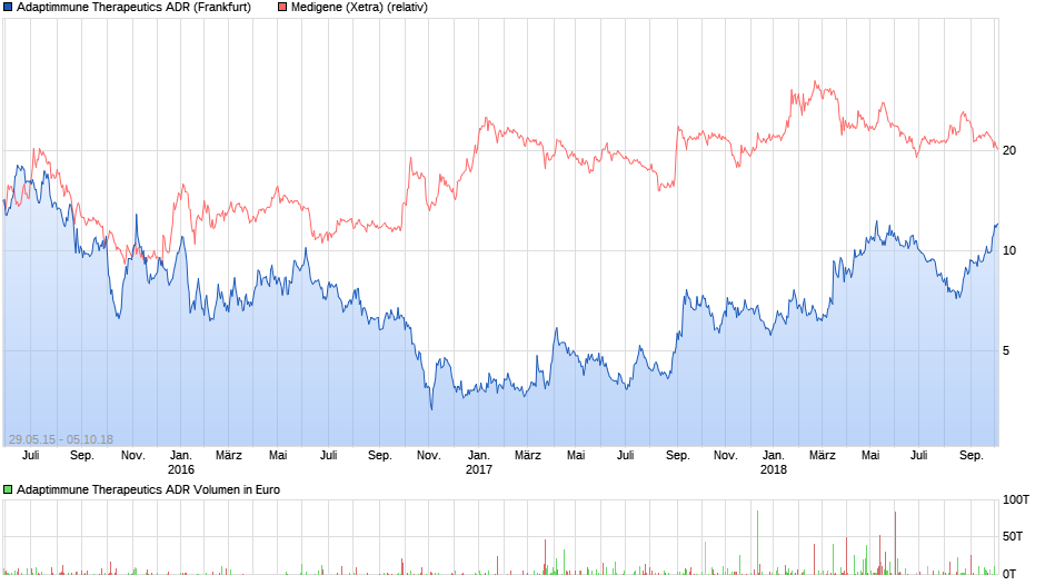 dass der Kurs der heimlichen TCR T-Zell Therapie Ausgründung von 2008 'Adaptimmune', mit heute 12.10€ in Frankfurt, absolut gesehen über dem Kurs der Stiefmutter Medigene liegt, seitdem diese sich mit der Übernahme der Trianta selbst wieder der TCR T-Zell Therapie verschrieben hat.