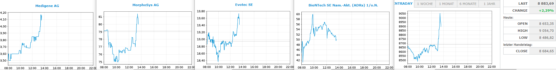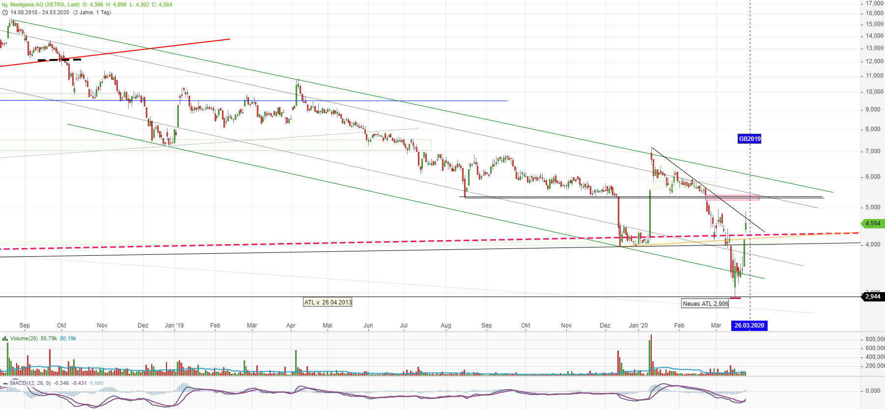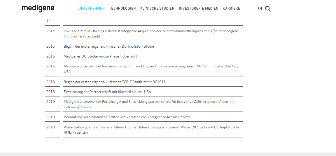 "...Die Kooperation mit IRICoR könnte uns zudem exklusiven Zugang zu einer noch unerschlossenen Welt von möglichen Zielantigenen für solide Tumore bieten. Wir freuen uns auf Fortschritte in unseren Partnerschaften mit bluebird bio und Roivant/Cytovant, von denen wir, unserer Meinung nach, sowohl finanziell wie auch wissenschaftlich profitieren. Wir sehen derzeit keine Auswirkungen auf unser Geschäft, die durch die Umstände der Coronavirus-Krise verursacht wurden, werden aber die Entwicklungen weiterhin genau beobachten. Darüber hinaus glauben wir, dass Medigene gut gegen diese Krise aufgestellt ist. ... ... Derzeit erwartet das Unternehmen keine wesentlichen Auswirkungen des vor kurzem ausgebrochenen Coronavirus auf Gesamterlöse, Forschungs- und Entwicklungskosten sowie EBITDA-Verlust. ...