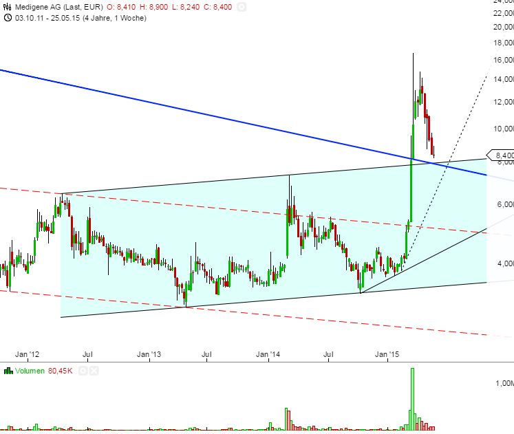 "Wind 8,23/8,37 Euro stabil unterschritten, drohen der Biotechaktie neue deutliche Verlustpotenziale. Die nächsten starken horizontalen Unterstützungen liegen dann erst zwischen 7,29 Euro sowie 6,69/6,88 Euro. Vorsicht: Neue Medigene News sind in dem sehr spekulativen Umfeld der Aktie immer für Impulse gut, die sich charttechnisch nicht ankündigen."