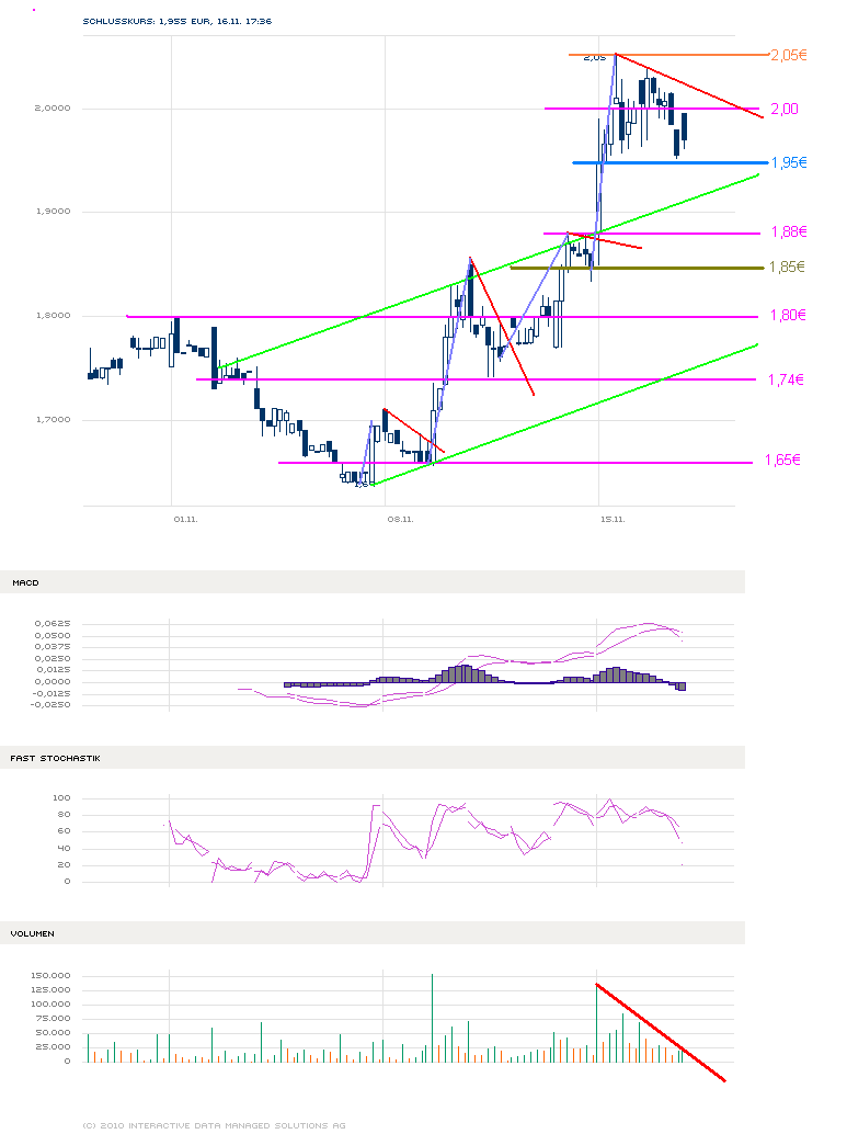 Kurzfristig kreuzt MACD und Stochastik negariv, Volumen ist rückläufig.. Mögliche Seitwärtsbewegung zw. 1,95-2,05.. Nur mit wieder anziehenden Volumen und Käufen, kann eine weitere Bewegung Richtung 2,17/18 einsetzen.. Und schlechtes Marktumfeld hilft "uns" auch nicht viel, drumherum..