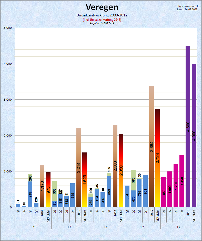 ..unterm Strich.. kann man gut die Finanzprognose definieren für 2013.. man plant locker mind. 0,5Mio€ bis maximal 2,0Mio€ Mehrkosten ein.. Art Sicherheitspuffer für zB Mehrkosten F&E usw. oder andere Aufwendungen. Denn - bezogen auf EBITDA2012 von -4,4Mio€ braucht man ja nur die noch in 2012 gezahlten 5Mio€ von Astellas negativ aufaddieren, dann hat man grob -9,4Mio als EBITDA für 2013.. das wäre aber auch nur dann so, wenn Veregen Zuwachs +/-0 zu 2012 hätte.. legt man aber mind. 33% weiteres Wachstum als Meßlatte an, die es auch braucht, um Umsatzprognose von mind. 7Mio€ für 2013 halten zu können, dann ist man schnell im +1,1Mio€ Bereich, was den Zuwachs beim Veregenumsatz 2013 angeht.. bei +50% wären es +1,7Mio€.. würde heißen Veregen käme in 2013 zw. eben 4,5-5Mio€ raus.. +2,5Mio feste sonst. betriebl. Erlöse (Eligardzahlungen Cowen) sind das dann 7,0-7,5Mio€ Gesamtumsatz.. Aber denkbar ist ohne weiteres auch dies - WENN diese Mehrkosten NICHT auftreten - das MDG 2013 die Prognose was GuV angeht TOPPEN wird.. mM.. dürfte nicht schwer werden.. so "könnte" der EBITDA evtl gar bei -7,5 Mio rauskommen evtl 2013.. schaun mer ma...