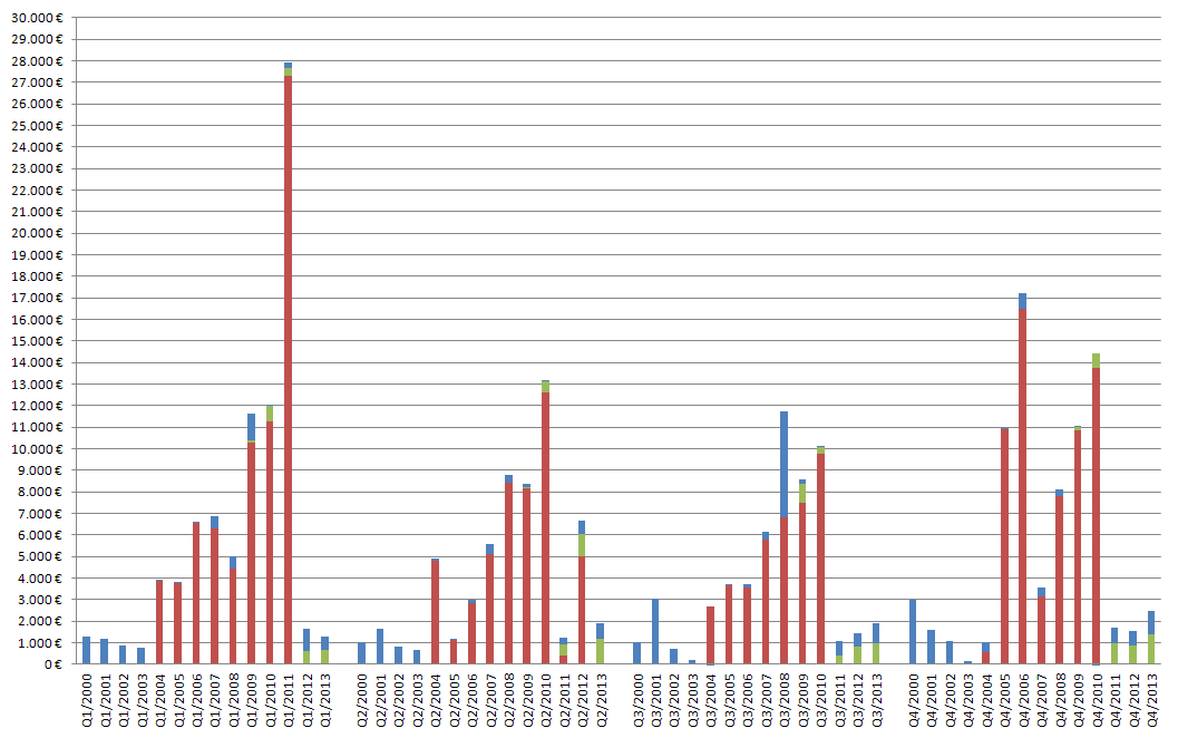 EndoTAG und Rhudex sind verpartnert und damit kostenseitig egalisiert. Bei Rhudex gibt es noch ein Upfront, das die Finanzierungsreichweite immerhin um ca. 3 Monate verlängert hat. Damit sollten es ca. 2-3Mio Euro sein. Das ist eine sehr gute Nachricht. Im EBIT enthalten sind Vertragsstrafen von Abbot für die Kündigung Veregen Deutschland in Höhe von 750T€ dafür gibt es einen Ausgleich von Taurus in Q1 in Höhe von 650T€. Das EBIT hätte in 2013 also deutlich unter 10Mio liegen können. So schlägt sich die Entlastung eben in 2014 nieder.