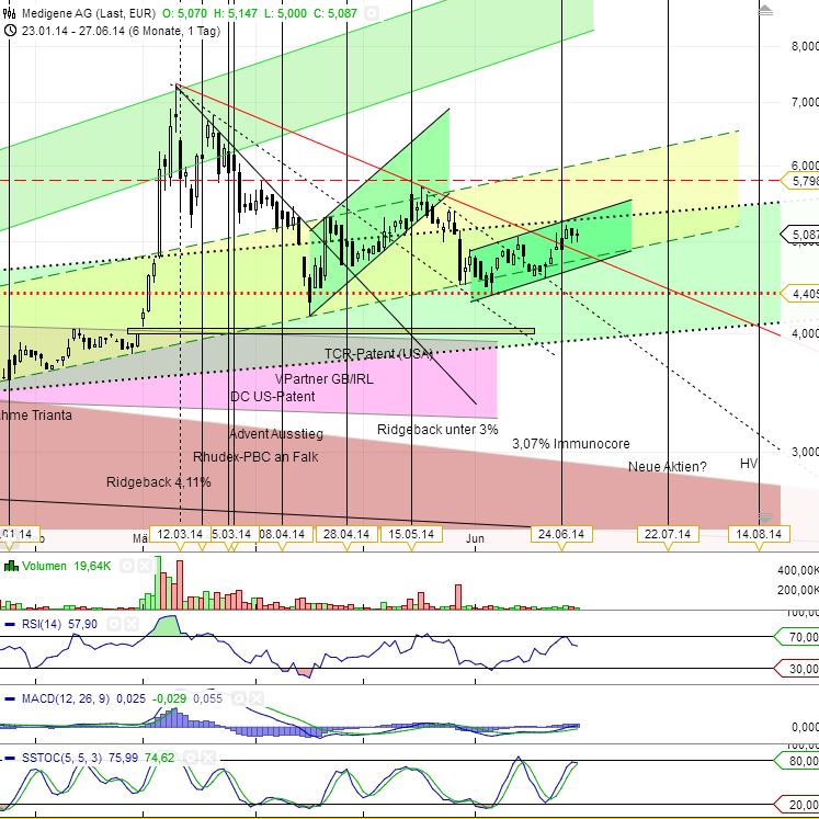 Kapitalerhöhung durch Ausgabe neuer Aktien: Das Unternehmen beabsichtigt, das Grundkapital von 10.889.950 EUR um bis zu 3.016.082 EUR auf bis zu 13.906.032 EUR durch die Ausgabe von bis zu 3.016.082 neuen Aktien aus genehmigtem Kapital zu erhöhen. Die neuen Aktien, welche gegen Bareinlagen bezogen werden können, werden den bestehenden Aktionären im Wege eines mittelbaren Bezugsrechts durch die Baader Bank AG, Unterschleißheim, angeboten. Das Bezugsverhältnis beträgt 7:2, das heißt, sieben alte Aktien berechtigen zum Bezug von zwei neuen Aktien. Ein organisierter Bezugsrechtshandel findet nicht statt. Der vorläufige Bezugspreis beträgt 5,00 EUR. Der endgültige Bezugspreis wird am 11. Juli 2014 im Bundesanzeiger und auf der Internetseite der Medigene AG (www.medigene.de) veröffentlicht und errechnet sich anhand der nachstehenden Berechnung: Soweit einer der beiden nachfolgenden Beträge höher ist als der vorläufige Bezugspreis, ist dieser höhere Betrag der Bezugspreis: (i) 80 % des ungewichteten Durchschnitts der XETRA-Schlusskurse der bestehenden Aktien während der Bezugsfrist für die neuen Aktien mit Ausnahme der letzten vier Tage der Bezugsfrist für die neuen Aktien bzw. (ii) 80 % des XETRA-Schlusskurses der bestehenden Aktien am fünftletzten Tag der Bezugsfrist für die neuen Aktien. Die Emission der neuen Aktien soll zu einem Brutto-Emissionserlös von bis zu 15,1 Mio. Euro führen.