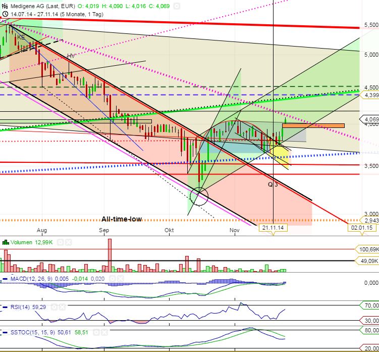 Womöglich der Befreiungsschlag ist der Aktie von Medigene gelungen. Die Aktie verzeichnete am Tag nach dem Eigenkapitalforum in Frankfurt einen deutlichen Satz über die Marke von 4,00 Euro, musste zuletzt zwar wieder etwas abgeben, konnte sich aber über diese Hürde halten. Zudem dürfte das Papier von den vor Kurzem veröffentlichten 9-Monatszahlen profitiert haben, die gut ausgefallen waren. Auf einer Jahrestagung in San Francisco wird Medigene zudem vom 6. bis 9. Dezember weitere Daten präsentieren. Kann Medigene das derzeitige Niveau verteidigen, können risikobereite Anleger durchaus über eine erste Position wieder nachdenken.