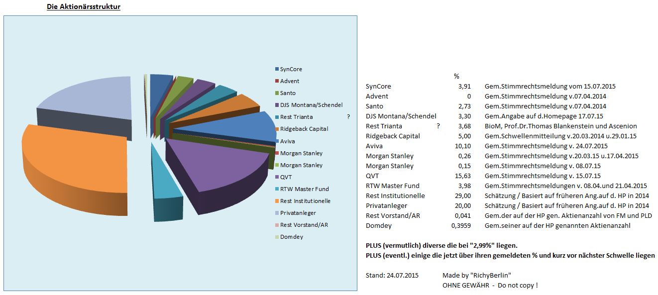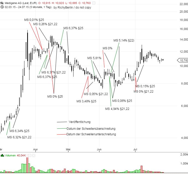1. Aviva Investors Holdings Limited hat uns am 22.07.2015 in einer Stimmrechtsmitteilung gemäß § 21 Abs. 1 WpHG mitgeteilt, dass der Stimmrechtsanteil der Aviva Investors Holdings Limited, London, Großbritannien an der Medigene AG am 20.07.2015 die Schwelle von 10 % überschritten hat und zu diesem Tag 10,01 % (1.965.649 Stimmrechte) beträgt.