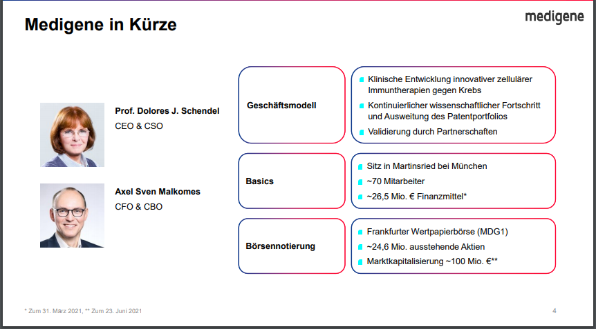 Prof. Dolores Schendel, Vorstandsvorsitzende und Wissenschaftsvorstand bei Medigene: "Die Entwicklungsprojekte von Medigene kamen 2020 und Anfang 2021 weiter gut voran. Unsere Projekte im Bereich solider Tumore haben beeindruckende präklinische Ergebnisse erzielt. Wir haben optimale T-Zell-Rezeptoren ausgewählt, einzigartige neue Tumor-spezifische Antigene analysiert und unsere funktionellen Verbesserungen für TCR-modifizierte T-Zellen, wie den PD1-41BB Switch-Rezeptor, weiterentwickelt, um in die feindliche Umgebung von Tumoren einzudringen.