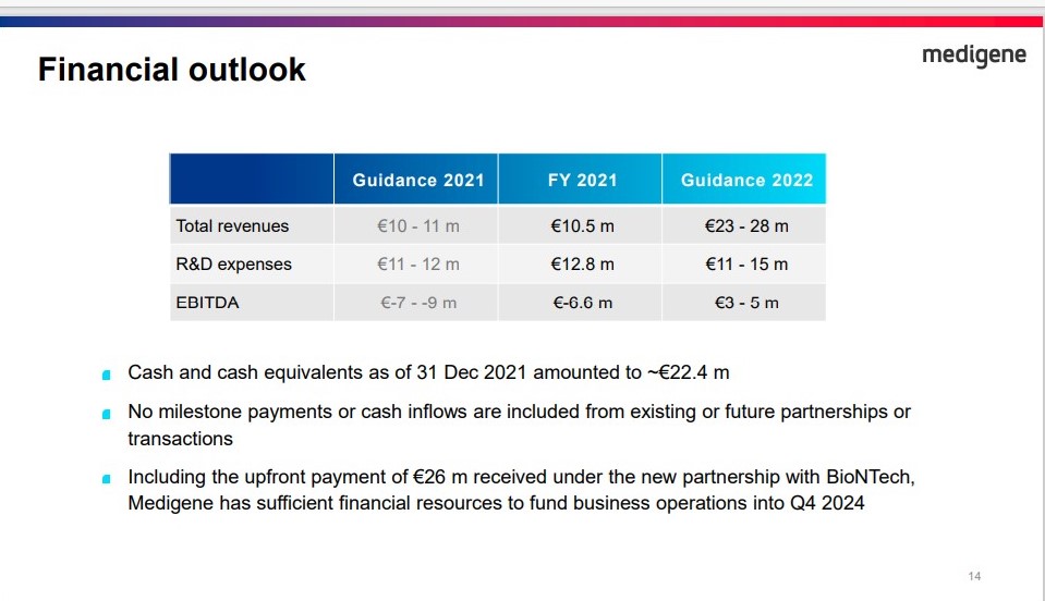 und Medigene kann potenzielle Zahlungen beim Erreichen von Meilensteinen in der Entwicklung, der Zulassung und der Vermarktung erhalten. Darüber könnte Medigene Anspruch auf Umsatzbeteiligungen am Nettoumsatz der Produkte in den jeweiligen Ländern zu einem niedrigen zweistelligen Prozentsatz haben. Weiter wird Roivant/Cytovant die bei Medigene im Rahmen der Kooperation anfallenden Forschungs- und Entwicklungskosten in Höhe von 600 T€ pro Quartal erstatten. Der Vertrag hat eine Laufzeit bis zum 31. Dezember 2023.