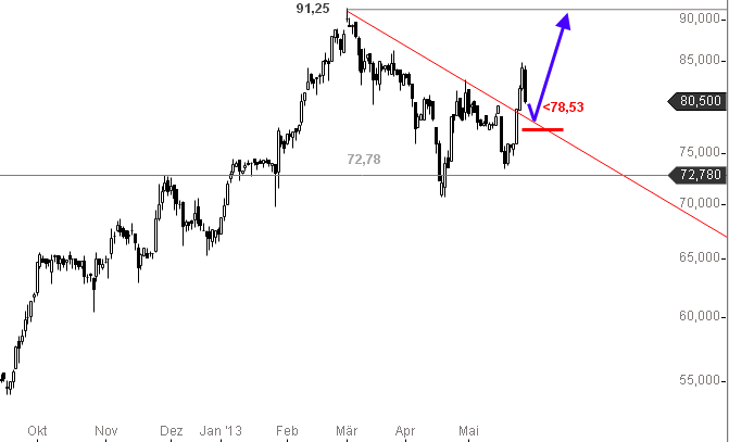 Auch gute Werte müssen gelegentlich mal durchatmen. Von daher einfach mal schauen wie die jüngste Konso jetzt weiter verläuft. Für mich ist die 78,53 garnicht so von großer Wichtigkeit. Für mich zählt erstmal mehr, daß man Mitte April einen Boden gefunden hat bei ca. 71 und dann Mitte Mai ein Higher Low bei ca. 73,5 ausgebildet hat. Solange diese Trendlinie hält, die ich an diese zwei Tiefpunkte gelegt habe, solange ist erstmal für mich die Bewegung noch intakt. Aktuell liegt die Linie bei ca. 75€. Meinetwegen kann man auch ein paar Wochen jetzt seitwärts laufen und dann diese Trendlinie erreichen. Wichtig ist nur diese zu verteidigen, wenn es zur Nagelprobe kommen sollte. Im übrigen sollte man auch die Stammaktien im Auge behalten, da eine Schere zwischen Vz und St. auf längere Sicht immer wieder gerne geschlossen wird. Aktuell halten sich die St. noch recht stabil. Von daher könnten die Vz. sich ja in absehbarer Zeit vielleicht dann den St. wieder weiter annähern. Dumm wäre nur wenn es anderesrum laufen sollte und die St. den Vz. entgegenkämen ;)
