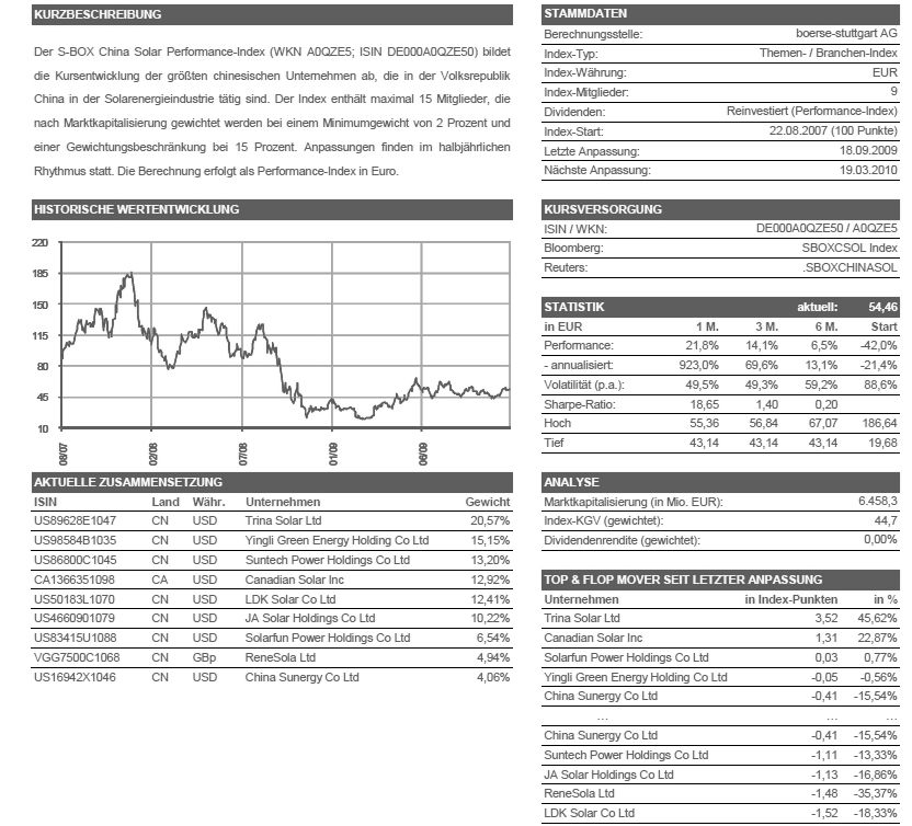 Der S-BOX China Solar Performance-Index (WKN A0QZE5; ISIN DE000A0QZE50) bildet die Kursentwicklung der größten chinesischen Unternehmen ab, die in der Volksrepublik China in der Solarenergieindustrie tätig sind. Der Index enthält maximal 15 Mitglieder, die nach Marktkapitalisierung gewichtet werden bei einem Minimumgewicht von 2 Prozent und einer Gewichtungsbeschränkung bei 15 Prozent. Anpassungen finden im halbjährlichen Rhythmus statt. Die Berechnung erfolgt als Performance-Index in Euro.