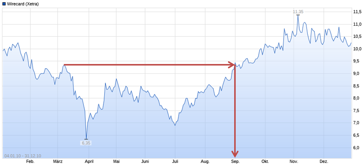 Der Kurs hatte sich bis zum 1. September 2010 erholt. Dauer der Erholung von Falschmeldung bis auf das Niveau vor Meldung: 6 Monate