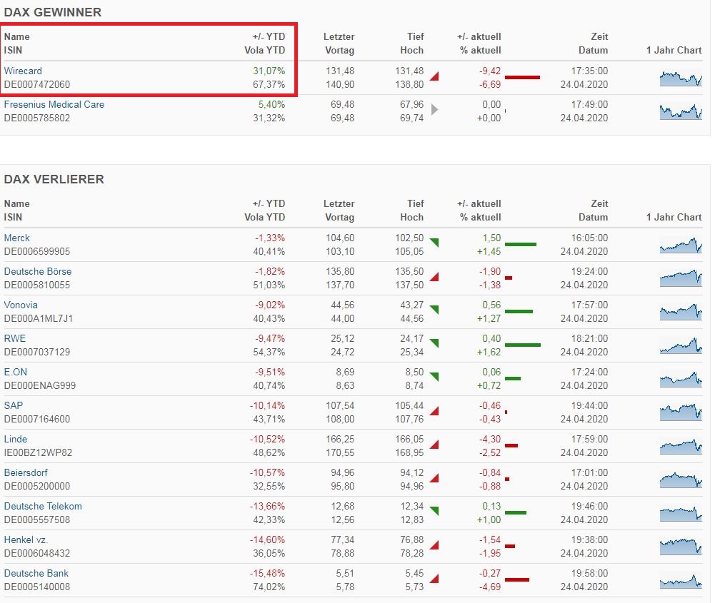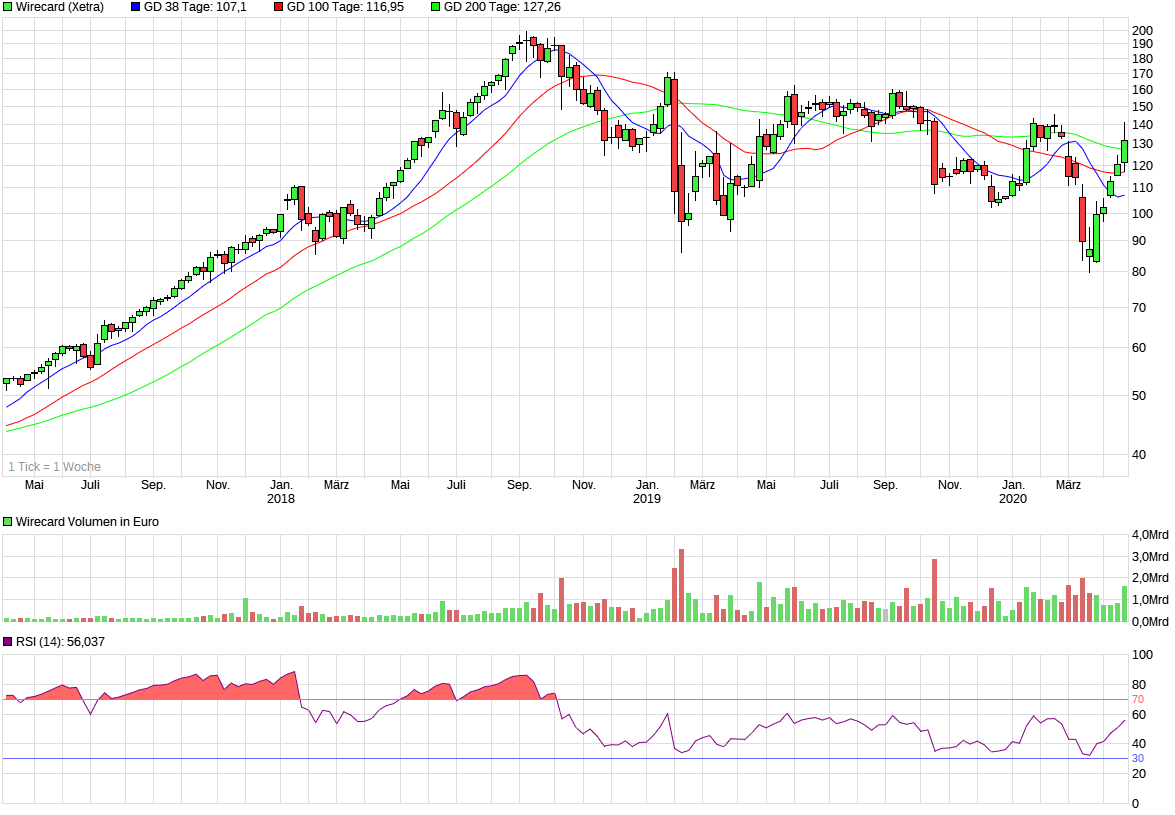 Wirecard AG: spekulativ kaufen. Sollte das Ergebnis der Sonderprüfung (Bekanntgabe eventuell bereits am Montag, 27. April) den Wirecard-Vorstand entlasten, so wäre das ein Befreiungsschlag für den Aktienkurs. Das nachfolgende Kursziel sähen wir dann bei 170,70 Euro; dem 2019er-Jahreshoch. Vorsichtige Anleger warten ein Ergebnis der Sonderprüfung ab, nehmen dann aber höhere Kurse in Kauf.