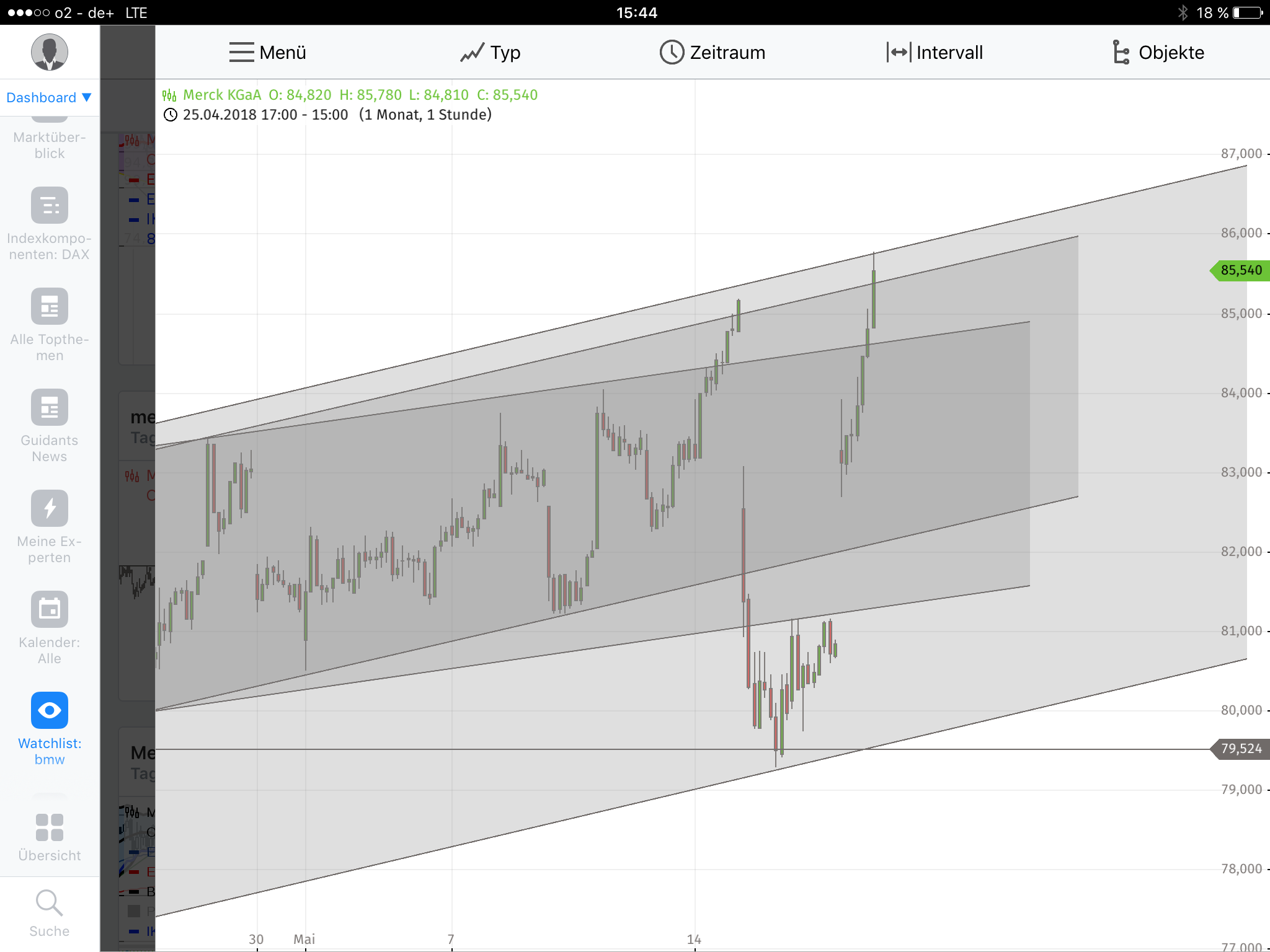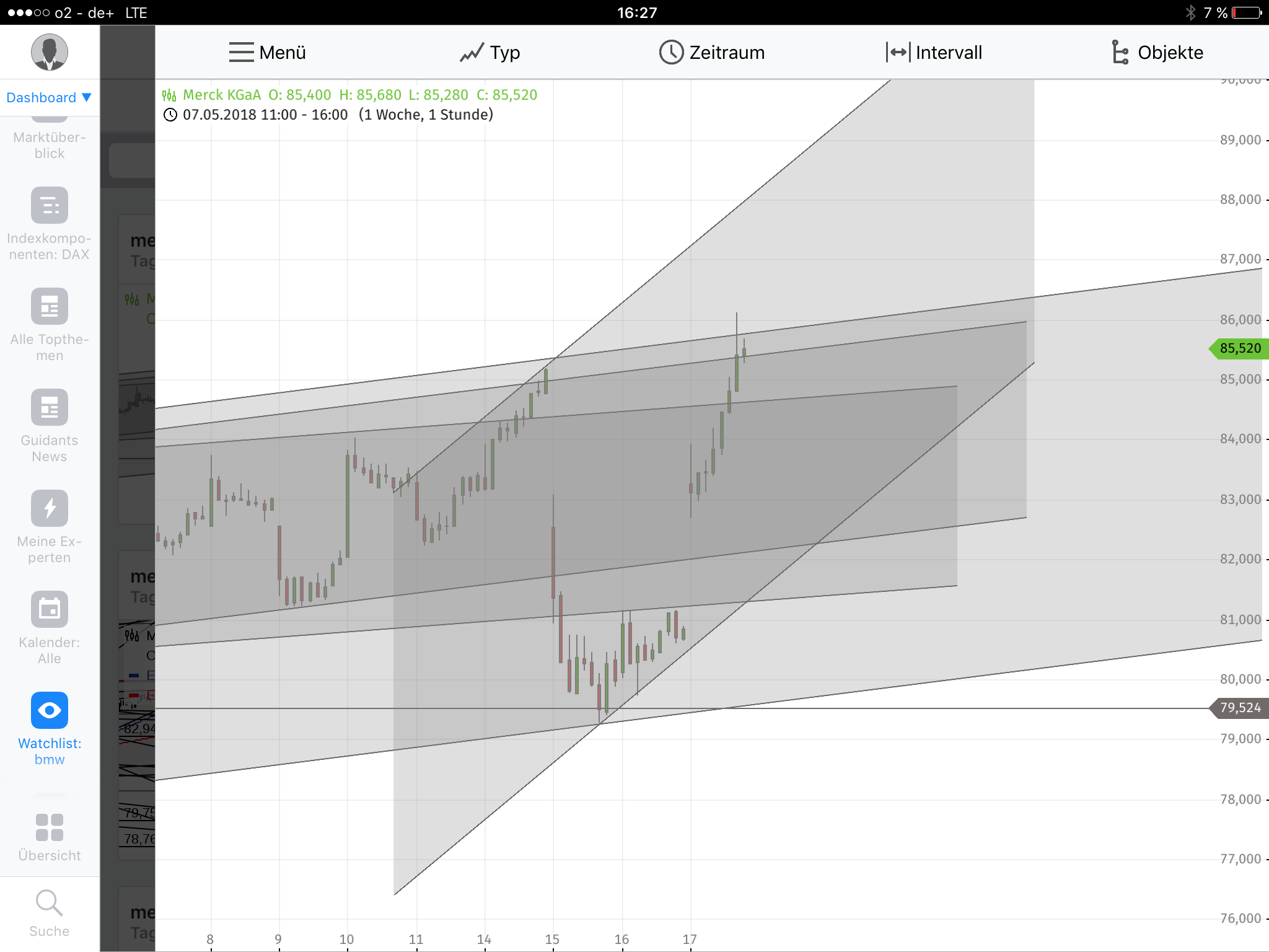 Diese kurzfristigen Betrachtungen halte ich viel zu willkürlich. Das wilde Kursgependel zwischen 85€ und 80€ innerhalb von nur drei Tagen ist für mich nicht aussagekräftig genug, um da technisch etwas "vernünftiges" ableiten zu können. Bei Trendlinien oder -kanälen sollten auch mehr als zwei Auflagepunkte vorliegen, sonst wirkt mir das Ganze viel zu konstruiert. Ich bin nicht so der Tradertyp und finde das schon echt stark, wenn hier jemand den Ausstieg ziemlich bei genau bei 85€ getroffen hat, und danach auch gleich wieder bei 80€ rein ist. :-)