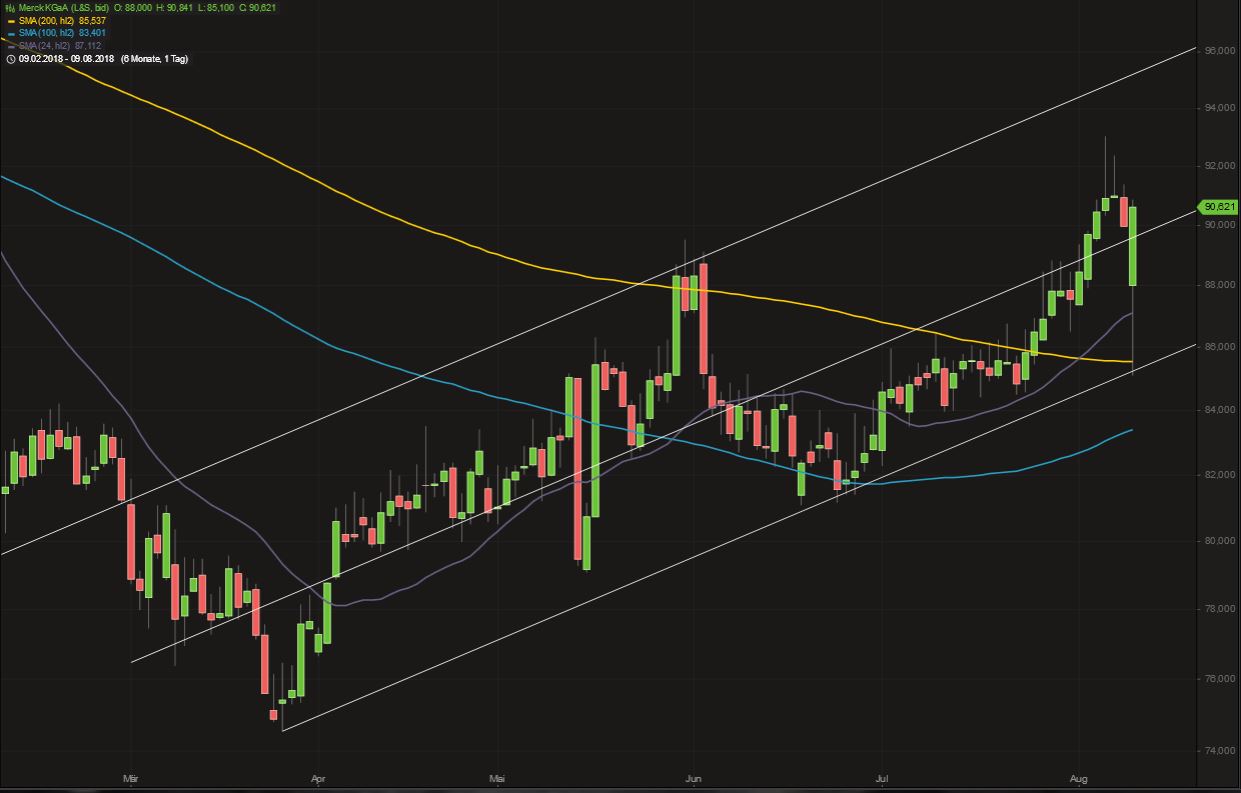 Bei der dicken roten Trendlinie habe ich das Januar-Hoch als Auflagepunkt genommen. Wenn ich statt der Tagesschlusskurse die Tageshochs verbinde, dann liege mit 82,80€ ziemlich dicht am Schnittpunkt der dicken TL (82,60€).