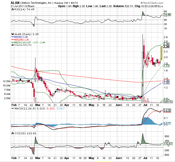 Shares of ALAN soared past 132% gains yesterday as the Company announced a definitive merger deal with YuuZoo Corp., a global provider of mobile targeted social networks, targeted advertising and mobile payment systems."
