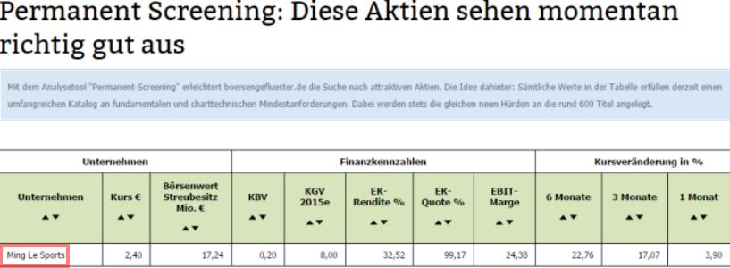 In den zurückliegenden 52 Wochen verlor Firstextile dann weitere 25 Prozent an Wert, Fast Casual Wear 8 Prozent, Ming Le Sports 46 Prozent, Haikui Seafood 45 Prozent, Ultrasonic 89 Prozent, Youbisheng 88 Prozent, China Specialty Glass 36 Prozent, United Power 33 Prozent, Powerland 22 Prozent, Joyou 9 Prozent, Vtion Wireless 9 Prozent und Asian Bamboo 54 Prozent – wohlgemerkt alles „on top“ auf die bereits oben verzeichneten Verluste.