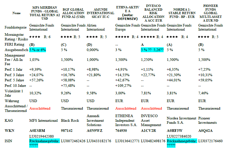 Hallo, heute war ich praktisch den ganzen Tag beschäftigt, indem ich versuchte, eine Entscheidung über mögliche Investitionsprodukte zu fellen. Ich möchte nämlich verschiedene Fonds zum KAG-Preis bei meiner Hausbank kaufen, also nicht an der Börse. Ich habe jetzt eine Tabelle mit den ausgewählten Fonds gemacht(beiliegend): WKN A0ESBM – 987142 - A0N9WZ – 764930 - A1CV2R - A0HF3W - A0Q62A. Alles klingt so gut und toll, aber ist es wirklich? Am Ende musste ich merken, wie der Preis aller diesen Fonds eine historische Höhe erreicht hat, wobei ich mich wundere, ob ich abwarten sollte, bevor ich mein fleißig gespartes Geld invertiere. Ich freue mich auf Kommentare von Forum-Mitgliedern. Danke