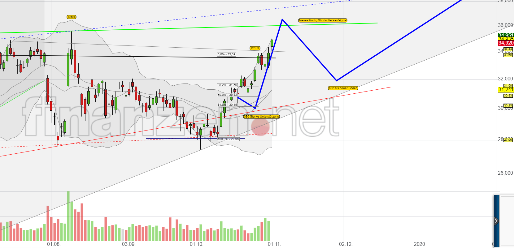 Ansonsten gib es nur einen Widerstand aktuell, da ist die Grüne Linie bei etwa $36. Diese kommt von den letzen zwei Hochs im Sommer. Danach ist dann erstmal frei bis $37,50 und darüber grenzenlos.