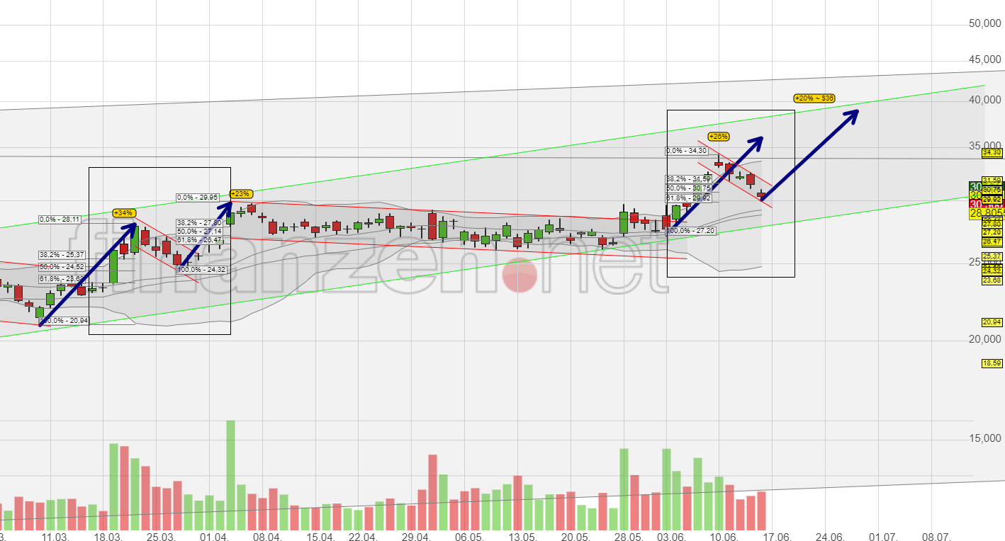 In dieser Woche sahen wir ein neues Jahreshoch, es wird in 2019 noch mehrere davon geben, davon gehe ich aus. Die E3 begann mit der Microsoft Präsentation sehr vielversprechend. Am Montag wurde ein neues Jahreshoch generiert. In den folgenden 3 Tagen ging es langsam runter, was im Bereich von 10% nach einem Jahreshoch, aus meiner Sicht normal ist. Dann kam die Broadcom Nachricht und es kamen noch einmal ein paar Prozent dazu. Gratulation an die, die bei $34 rausgegangen sind und den Gewinn mitgenommen haben. Wer dabei geblieben ist, sollte es jetzt auch weiterhin bleiben. Wer Nachkaufen will sollte die nächsten 2 Wochen in Auge behalten.