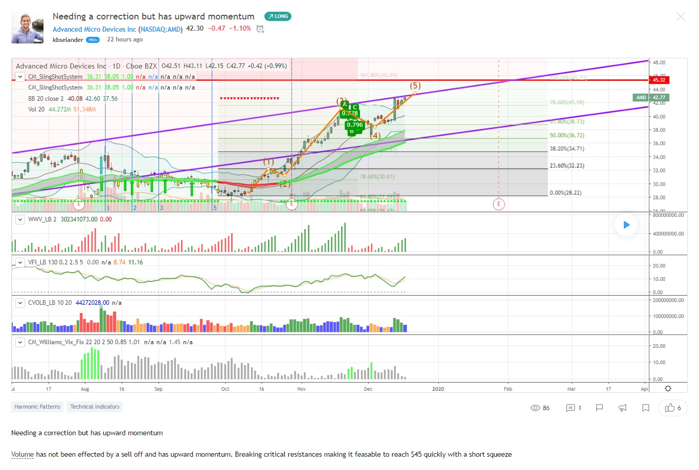 "Needing a correction but has upward momentum Volume has not been effected by a sell off and has upward momentum. Breaking critical resistances making it feasable to reach $45 quickly with a short squeeze"