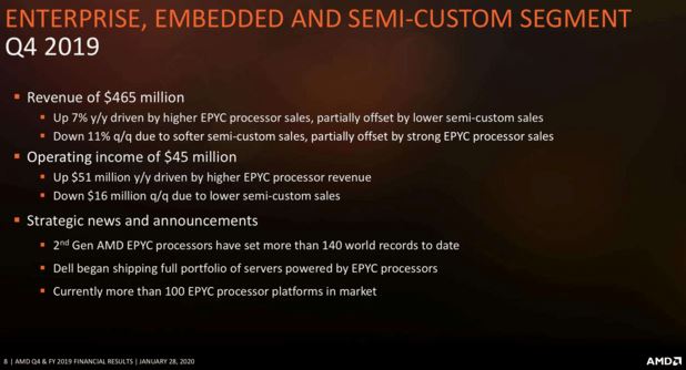 Vergesst bitte nicht, dass wir im letzten Jahr bereits einen deutliche Rückgang beim Semicustom Geschäft (wie z.B. bei den Konsolen-Chips) hatten, was auch ganz normal ist, wenn ein Produktzyklus zu Ende geht. Bald kommen jedoch die neuen Konsolen + Stadia, etc.