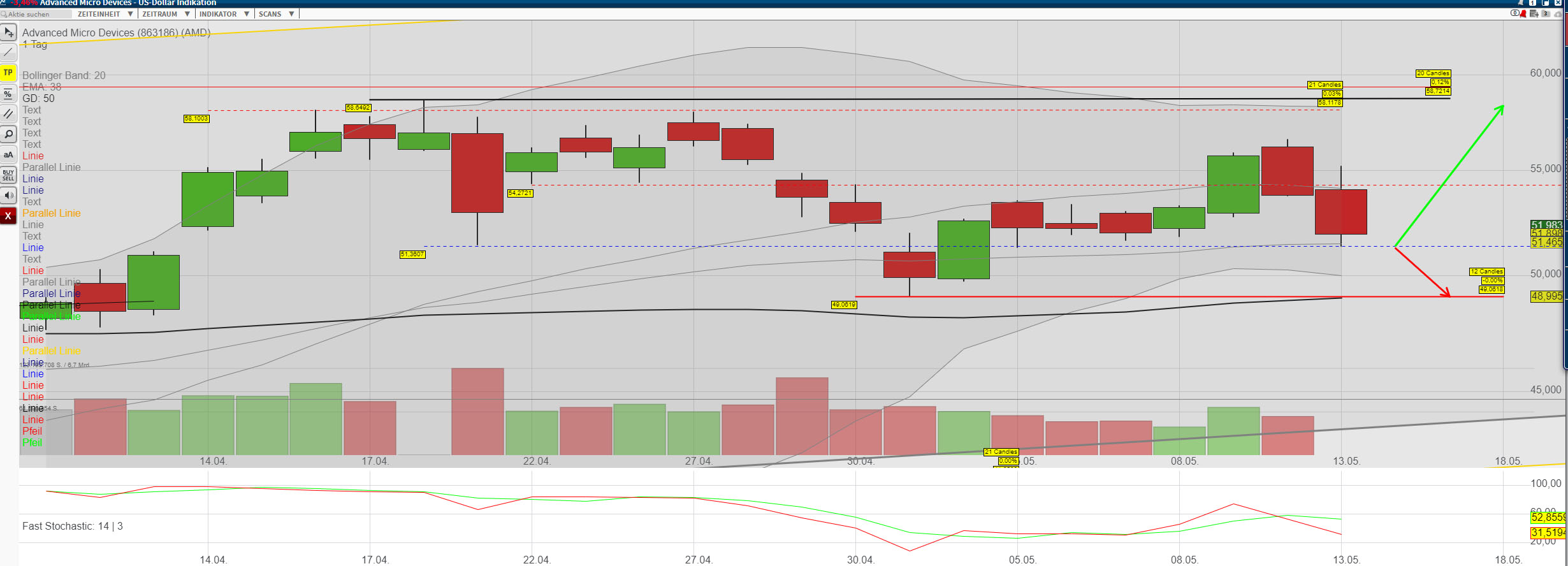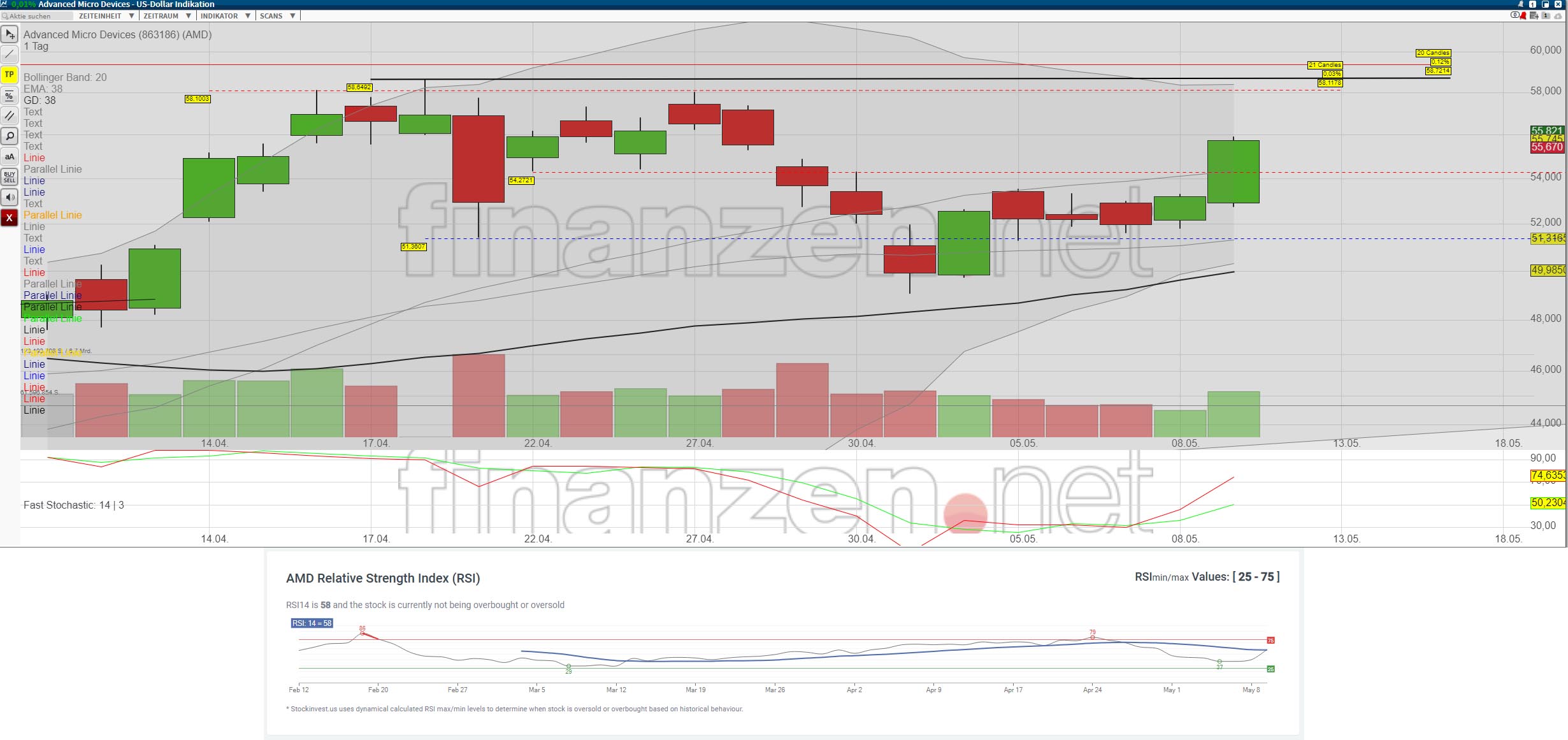 Nach den Q1 Zahlen vom 28.4 gab es einen Abverkauf auf $49,09 am 1.Mai gestern hatte AMD $53,19 zum Ende des Handels, Nachbörslich waren es $53,27. Der Nasdaq ist gestiegen und AMD war diesmal nur im Mittelfeld mit 6,64% in der letzten Woche dabei. Nvidia hat in der letzten Woche besser performt. Durch die abgeschlossene Übernahme von Mellanox und den guten Nachrichten bzgl. Ihrer Neue Grafikkarten sind sie um 10,51% gestiegen. Intel nur um 3,83%. Der Spitzenreiter im Technikbereich war Skyworks Solution mit 12,54%.