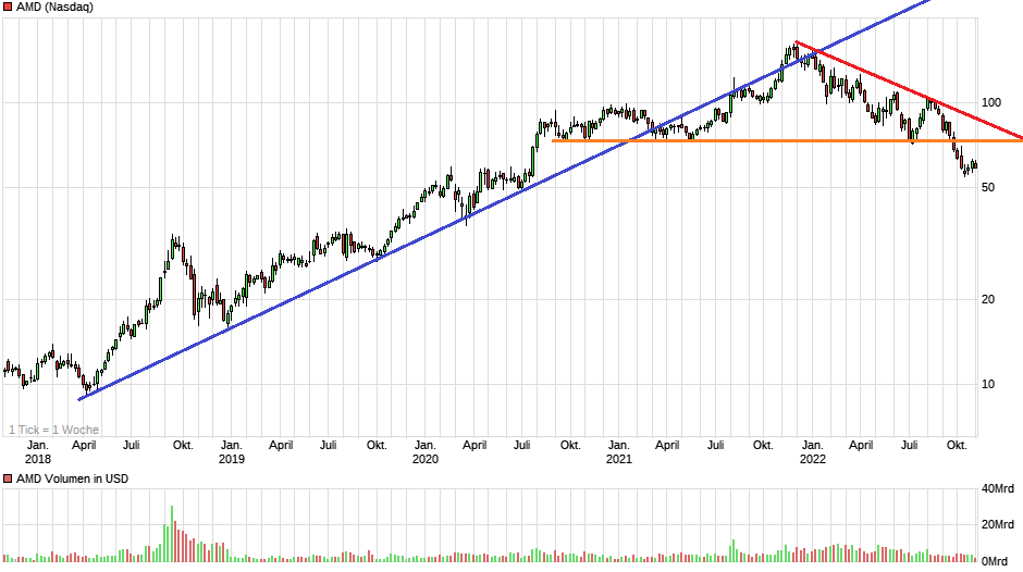 SANTA CLARA, Calif., Nov. 01, 2022 (GLOBE NEWSWIRE) -- AMD (NASDAQ:AMD) today announced revenue for the third quarter of 2022 of $5.6 billion, gross margin of 42%, operating loss of $64 million, net income of $66 million and diluted earnings per share of $0.04. On a non-GAAP(*) basis, gross margin was 50%, operating income was $1.3 billion, net income was $1.1 billion and diluted earnings per share was $0.67.