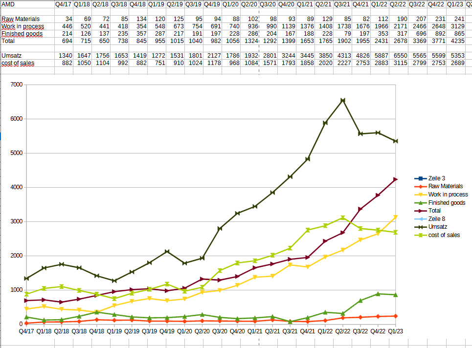 Das die grünen Linien, Cost of Sale und Finished goods, die letzten 3 Quartale ein ungewöhnliches Verhalten zeigen, dürfte an den veringerten Auslieferungsmengen seitens AMD liegen. Soll sich ab Q3 ja wieder normalisieren. Also Finished Good wieder runter und Cost auf Sales wegen mehr verkauften Produkten wieder rauf.