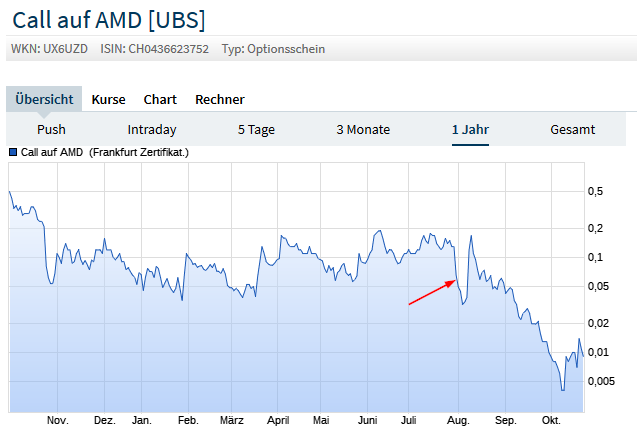 Mein EK liegt bei 12 Cent. Dies wird, wegen der mangelnden Zeit, wahrscheinlich nur übersteigen, wenn AMD auf $40 steigen würde. Ich denke Verlust werde ich machen, es sei denn ich kaufe nochmals ordentlich nach und Drücke auf die 6 Cent ~euren EK. Da gibts nach den Zahlen noch einmal die Chance, dann müsste ihr raus. Es sei den AMD knackt die $40 bis Anfang Dezember. Das ist jetzt aber natürlich ein Zock. Ich kaufe selbst aber nicht mehr nach, habe schon zu viel drin.