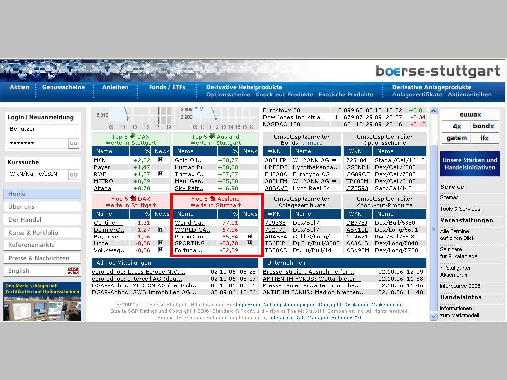 Die Online-Casino-Aktien und Wett-Aktien erlitten bereits Monate im Vorfeld der verschiedensten Verbots- und Legalisierungsbemuehungen in USA und Europa, Kursverluste um bis zu 90 Prozent! Aufgrund der Verabschiedung des zahnlosen US-Gesetzes ist jetzt die Unsicherheit aus den Aktien weitgehend raus.
