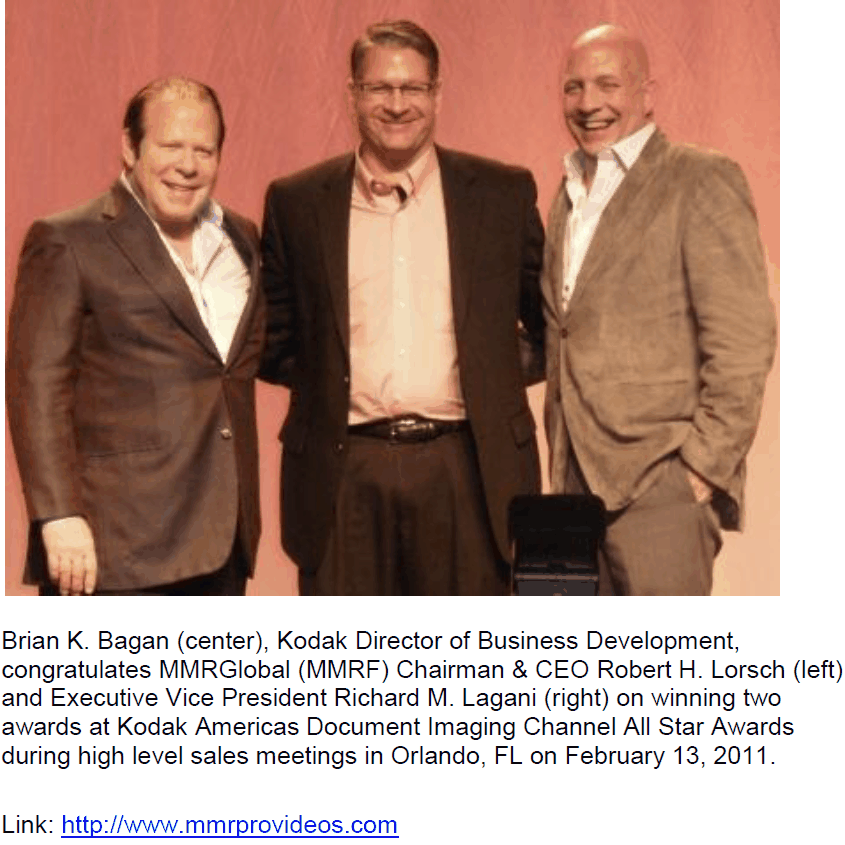 MMRGlobal, Inc., through its wholly-owned operating subsidiary, MyMedicalRecords, Inc. (MMR), provides secure and easy-to-use online Personal Health Records (PHRs) and electronic safe deposit box storage solutions, serving consumers, healthcare professionals, employers, insurance companies, financial institutions, and professional organizations and affinity groups. MyMedicalRecords enables individuals and families to access their medical records and other important documents, such as birth certificates, passports, insurance policies and wills, anytime from anywhere using the Internet. The MyMedicalRecords Personal Health Record is built on proprietary, patented technologies to allow documents, images and voicemail messages to be transmitted and stored in the system using a variety of methods, including fax, phone, or file upload without relying on any specific electronic medical record platform to populate a user's account. MMRGlobal's professional offering, MMRPro, is designed to give physicians' offices an easy and cost-effective solution to digitizing paper-based medical records and sharing them with patients in real time through an integrated patient portal. MMR is an Independent Software Vendor Partner with Kodak to deliver an integrated turnkey EMR solution for healthcare professionals. MMR is also an integrated service provider on Google Health. To learn more about MMRGlobal, Inc. and its products, visit www.mmrglobal.com.
