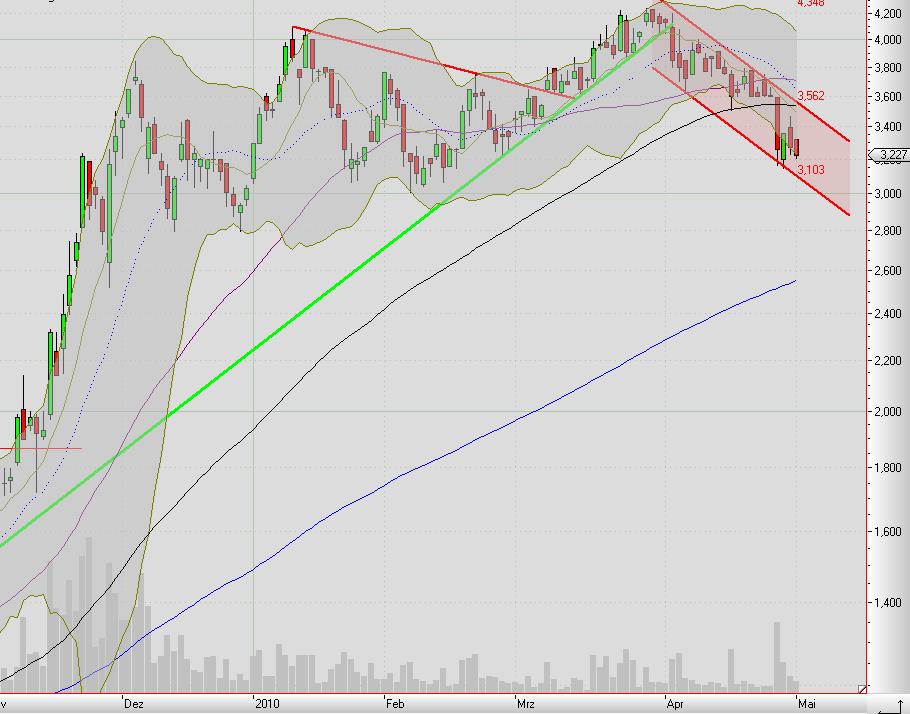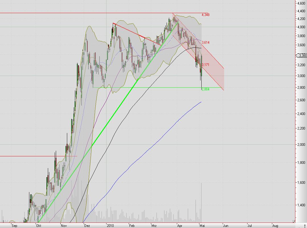 nein. hatte meine verbio bei 4,05 verkauft, nachdem sie unter "meine" aufwärtstrendlinine gefallen waren. bereut habe ich es bisher nicht. technisch ist verbio auch noch nicht über den berg. ist jetzt gerade mal im alten abwärtstrend und im tagesbollinger zurück. indikatoren liefern auch noch keine kaufsignale. noch unter mitte bollinger, ma100 etc. fundamental hatte ich weiter oben was zu verbio geschrieben. für 2010 siehts da eigentlich nicht so gut aus. erst ab 2011 wieder interessant. deswegen ja auch der abverkauf nach den zahlen. bin mal gespannt ob der aktionär das drehen kann, bin da eher skeptisch.