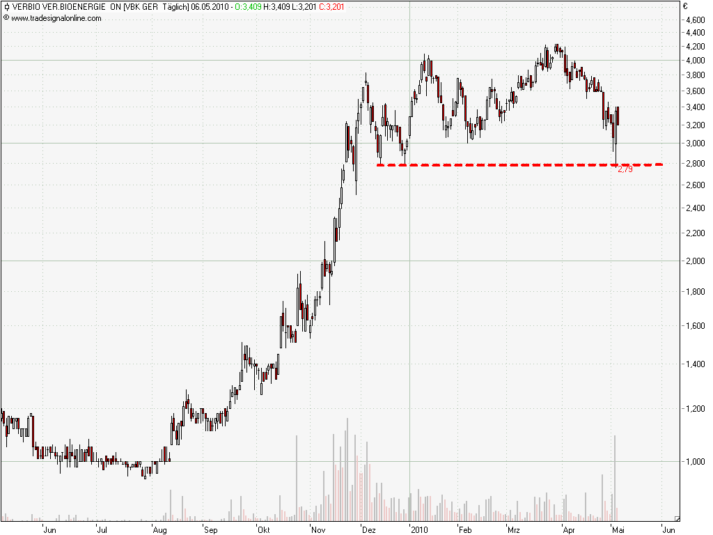 Stabile Rohstoffpreise vorausgesetzt, erwarten wir für VERBIO im Geschäftsjahr 2010 eine deutliche Umsatzsteigerung, wobei der Umsatzbeitrag aus der Produktion und Einspeisung von Biogas circa EUR 6 Mio. betragen wird. Daneben halten wir eine Entwicklung hin zu einem positiven Ergebnis vor Zinsen und Steuern (EBIT) für das Gesamtjahr im einstelligen oberen Millionen-Euro-Bereich für realistisch. Wesentliche Ergebnisbeiträge streben wir durch die ersten Erträge aus den Biogasanlagen und die mit dem Betrieb dieser Anlagen verbundenen Kosteneinsparungen sowie den möglichen Verkauf weiterer Windkraftanlagen an.