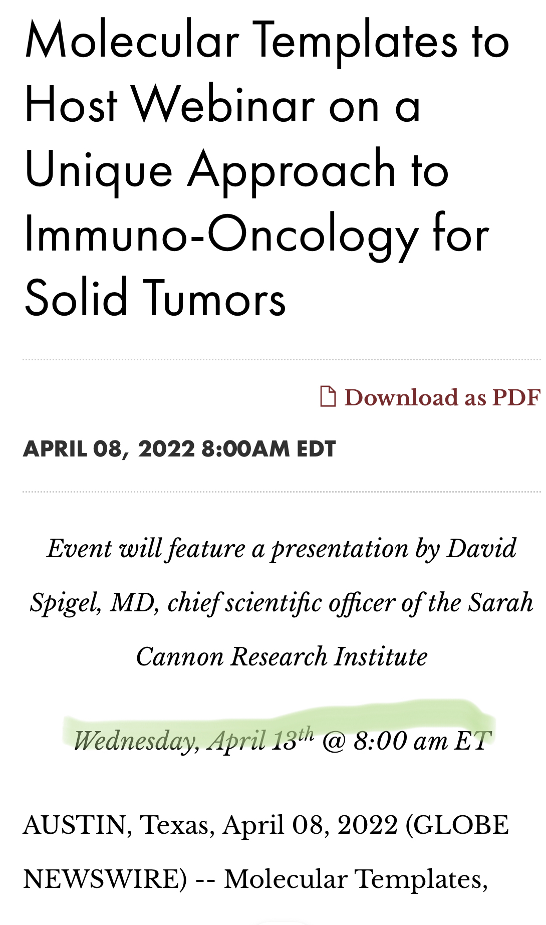 Totgesagte leben länger - so auch Antibody Drug Conjugates (ADC) - aber es gibt eine neue Klasse von Immunotoxinen die Molecular Templates ( NASDAQ Kürzel MTEM, Internetauftritt siehe www.mtem.com ) als 'Engineered Toxin Bodies' (ETBs) zur Behandlung von Krebs ins Spiel bringt und die weitreichendere Manipulationen von Krebszellen ermöglichen als die klassische ADC-Technik. Bei MTEM sind es gleich drei Generationen von ETBs die über eine erzwungene Aufnahme in die Krebszellen die Abschaltung von deren Ribosomen (1-te Generation) sowie gentechnische Veränderungen (2&3-te Generation) die zu einer besseren Verträglichkeit (De-Immunisation) und Abtötung der Zellen führen. Gleichzeitig ermöglichen ETBs der zweiten Generation ähnlich wie ADC die Einschleusung einer für den Tumor tödlichen Nutzlast sowie einzigartig in der dritten Generation die eines fremden Antigens (Antigen Seeding Technology, AST), welches dann als solches von Immunsystem des Patienten eigenen T-Zellen erkannt werden kann und zur natürlichen Abtötung der Tumorzellen führt.
