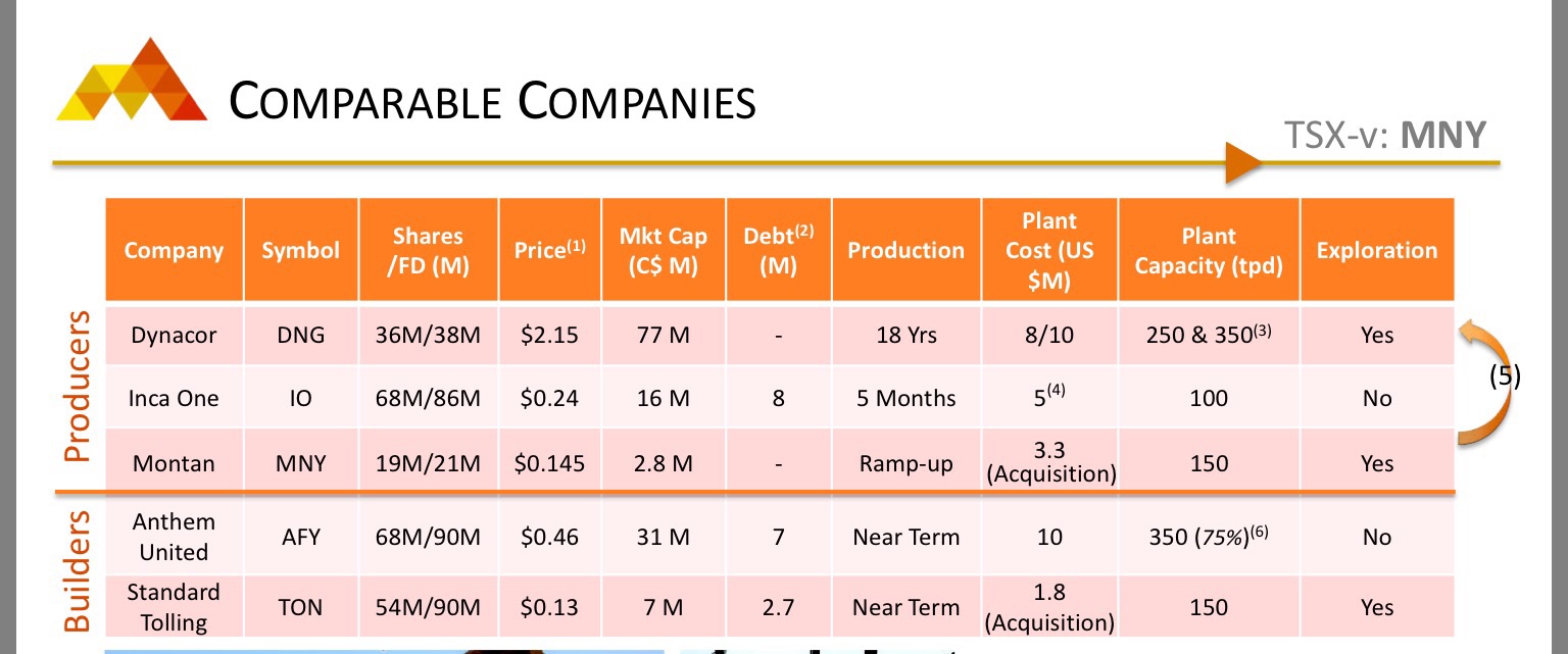 Mit dieser Übernahme wird Montan das dritte an der TSX notierte Betriebs- bzw. Produktionsunternehmen, das neben Inca One Gold Corp. (Betriebs Chala wird derzeit auf 100 t/Tag erweitert) und Dynacor Gold Mines Inc. (Betrieb Huanca wird derzeit auf 300 t/Tag erweitert) in der Golderzverarbeitung in Peru aktiv ist.